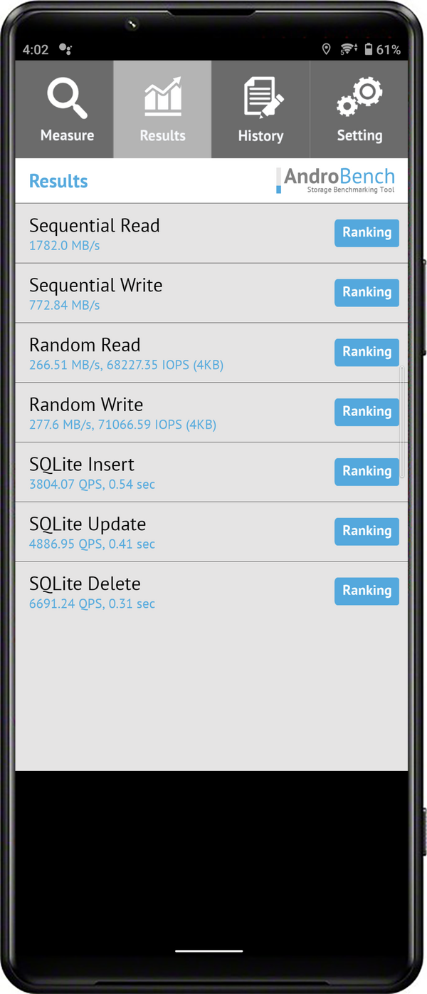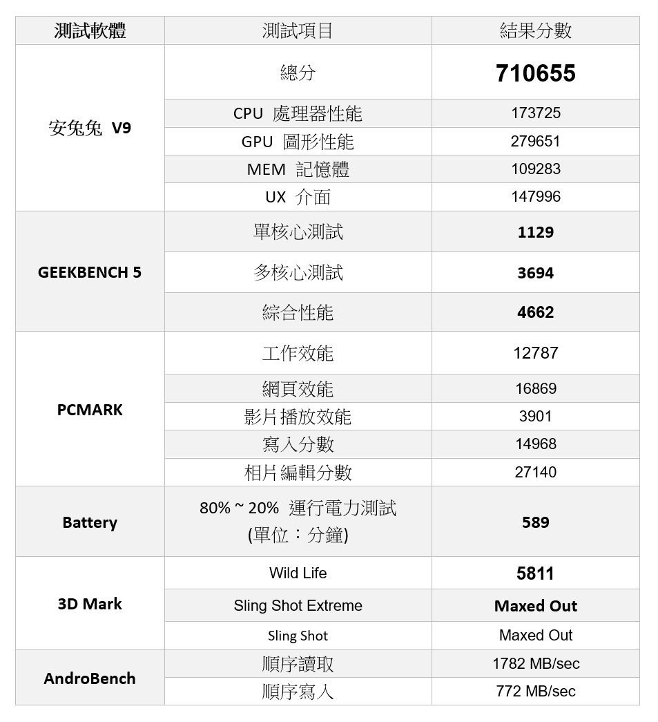 其實除了 CPU 處理器與記憶體,內建儲存空間的讀取/寫入速度也非常影響到日常使用的順暢度,這裡使用 AndroBench 實測讀寫速度,測得的結果為讀取 1782 MB/sec MB,寫入為 772 MB/sec
