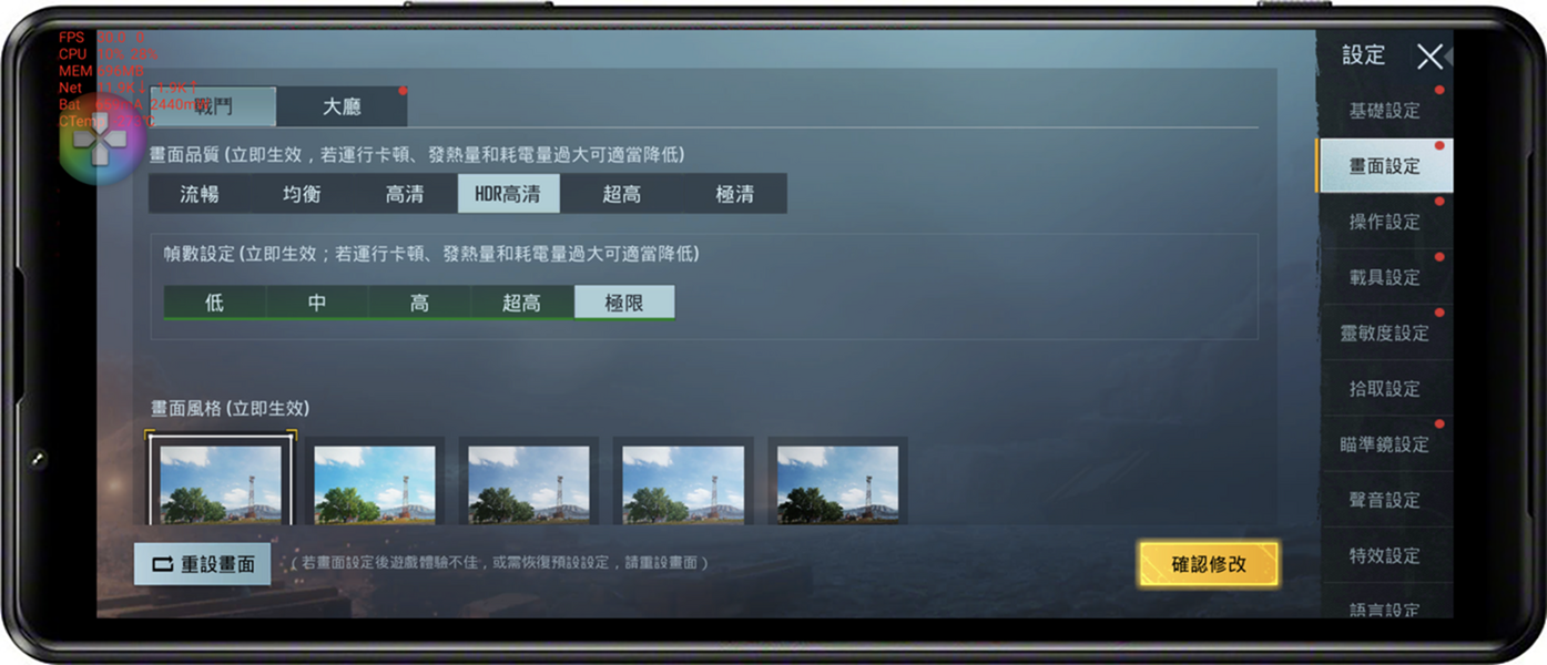 不囉嗦直接將遊戲設定到 Xperia 1 II 可以設定的最高值『HDR 高清』+『極限』偵數設定