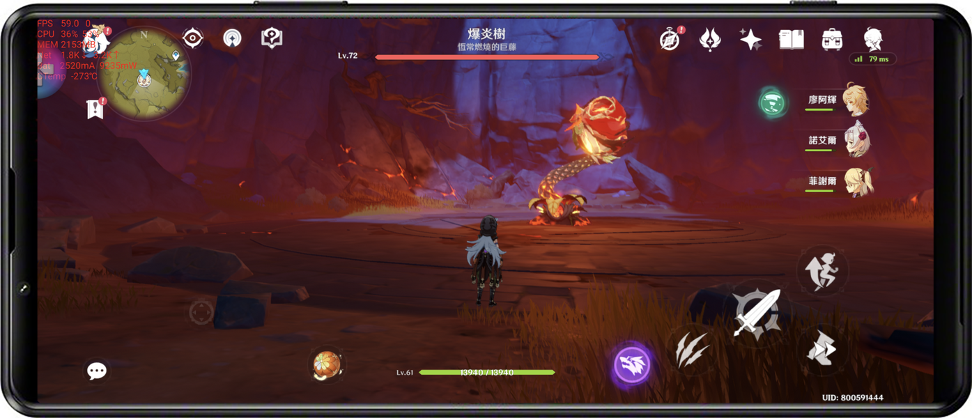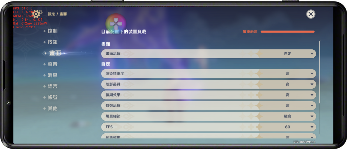 目前公認手機上前幾大高負載的大型遊戲原神,直接測試最高畫質 + 60 fps 測試