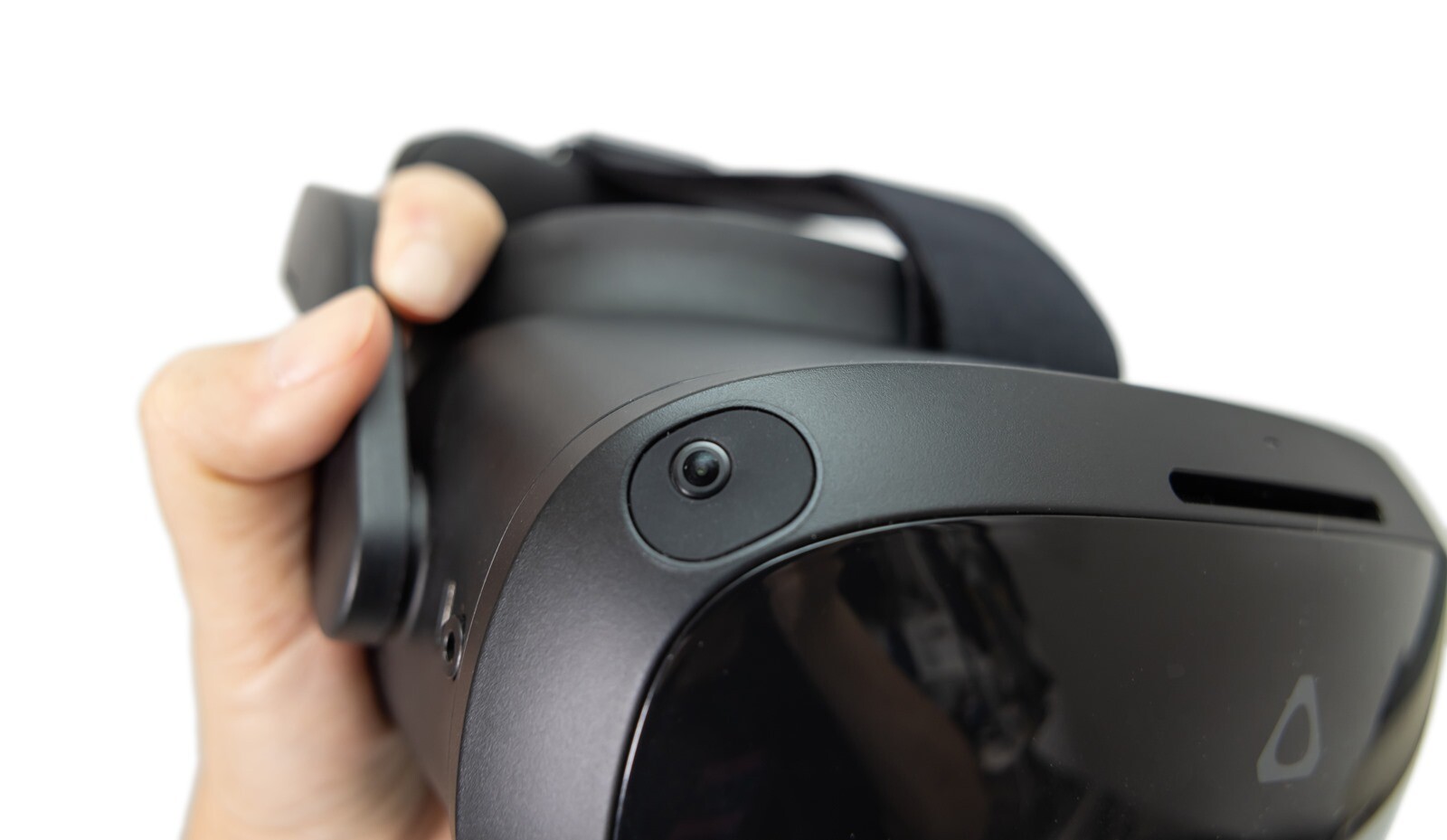 拿出 VIVE Focus 3 頭戴本體,VIVE Focus 3 在定位方面採用了正面上下兩組各四個鏡頭實現的 inside-out 定位技術