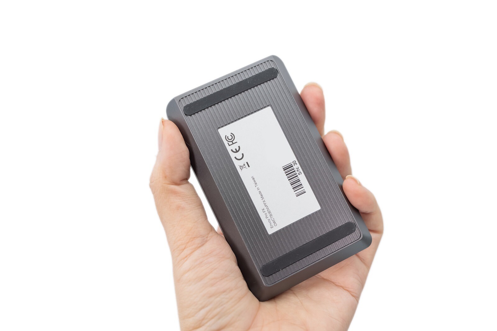 拿出今天主角 OWC Envoy Pro FX ,就像是金屬方塊的外型質感十分優異,說是阿輝看過最有質感的外接儲存裝置(包含隨身碟與 SSD/外接硬碟)都沒什麼問題