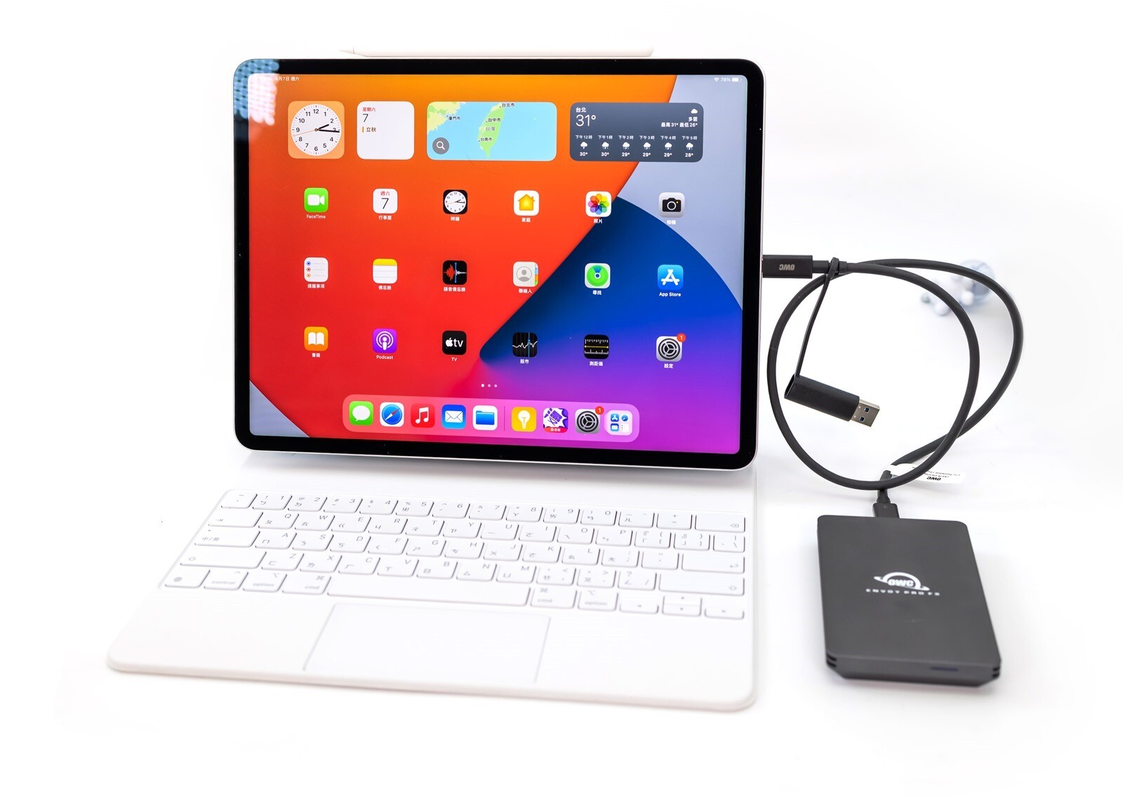 iPad Pro 也可以使用,不過測試 iPad Pro 2021 連接 OWC Envoy Pro FX 時,燈號是綠色應該是連接在 USB 模式而不是 Thunderbolt 模式,而 iPad Pro 2021 M1 版本一個很大的重點也是採用了 Thunderbolt 接口,是 iPad Pro Thunderbolt 接口只用於電腦連接還是 OWC Envoy Pro FX 的相容性配合問題?這大概後續有答案在和大家補充報告吧!