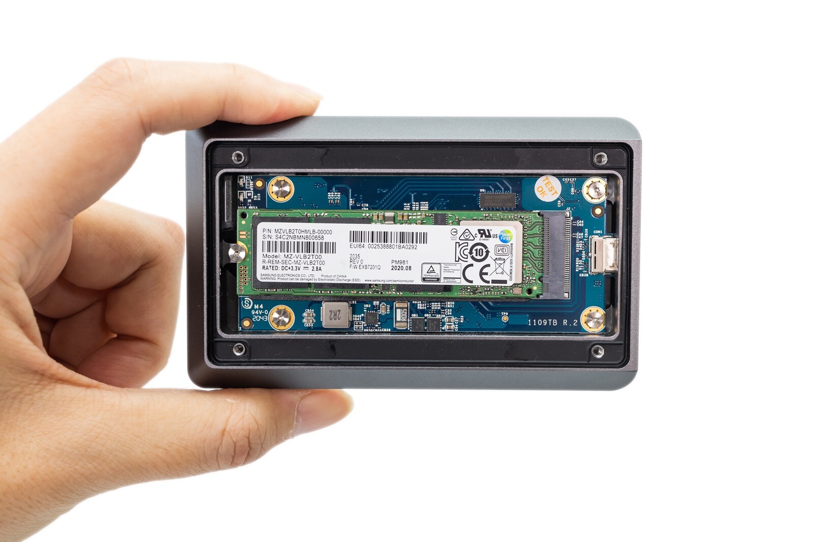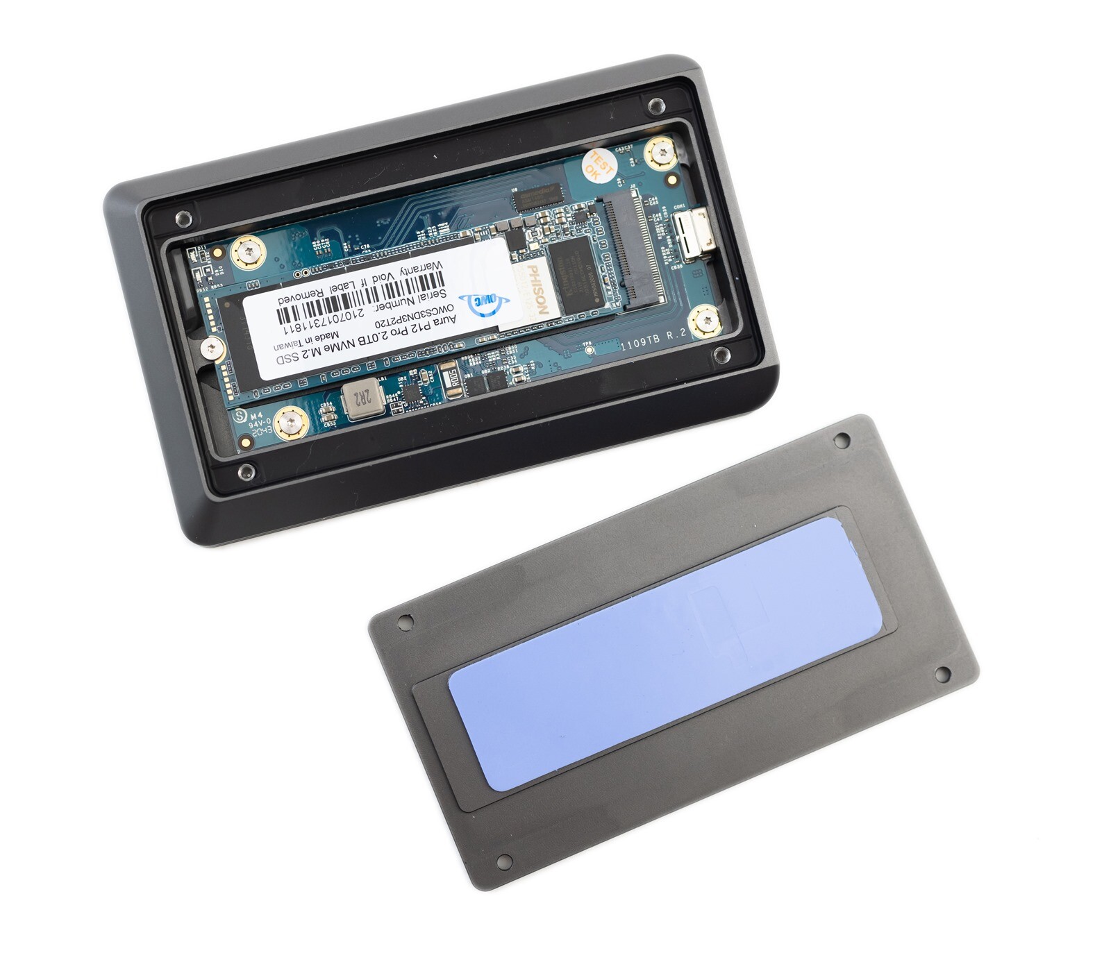 也拆開看看吧!儘管 OWC Envoy Pro FX 因為認證原因無法單獨銷售外接盒,不過 OWC Envoy Pro FX 要自行更換 SSD 沒有多大問題,螺絲也沒有特別防拆貼紙,當然要自己更換的話保固問題自行負責就是了;阿輝購入的 OWC Envoy Pro FX 為 2TB 版本,裡面為 Aura P12 Pro 2TB NVMe M.2 SSD