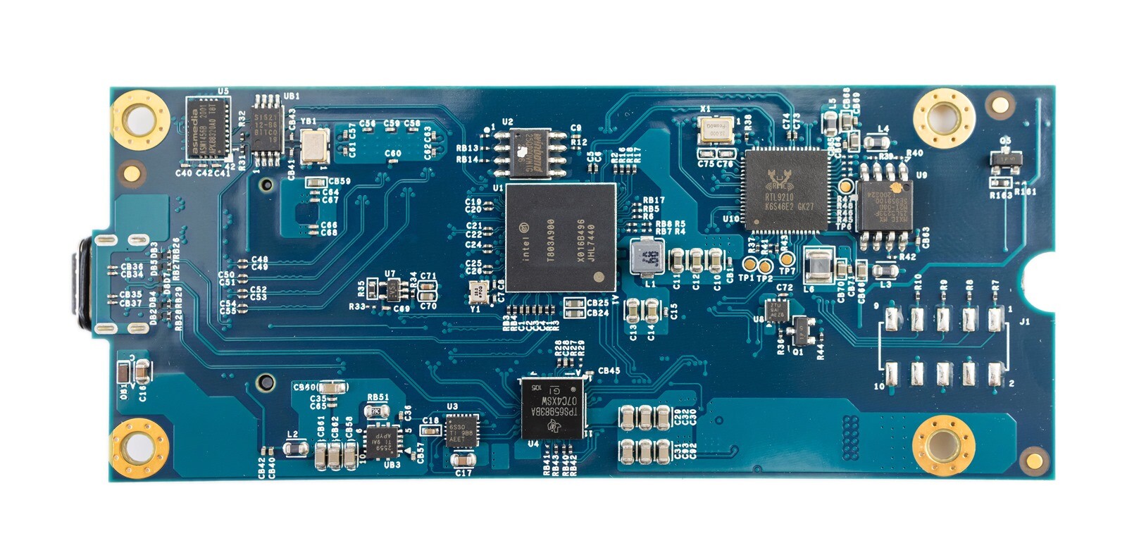 拆開可以看到電路版上同時有 Thunderbolt 3 傳輸使用的 Intel Titan Ridge 控制晶片與 USB 模式的 Realtek RTL9210 控制晶片計。