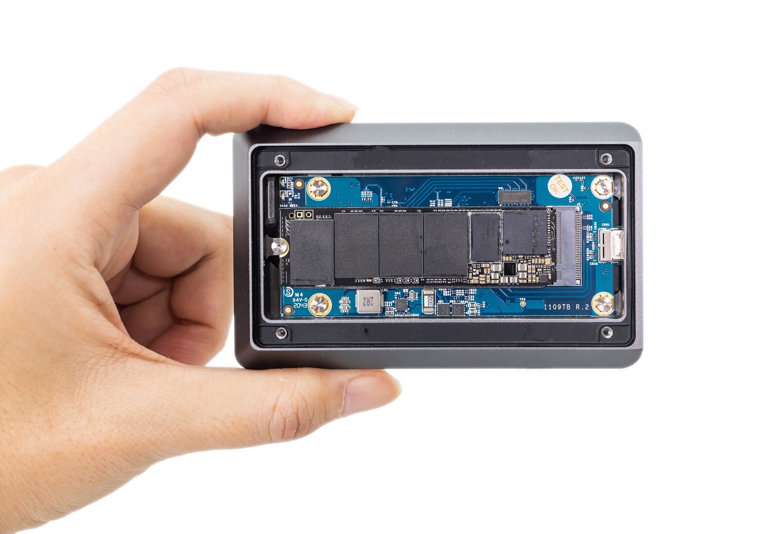 而 OWC Envoy Pro FOWC Envoy Pro FX 最讚的就是同時支援 Thunderbolt 與 USB 3.2 Gen2 兩種傳輸協議,OWC Envoy Pro FX 實現雙傳輸協定的方式其實很直接暴力,就是同時內建 Intel Titan Ridge (Thunderbolt) 與 Realtek RTL9210 (USB) 兩組控制晶片,並且自動依照連接的設備自動切換