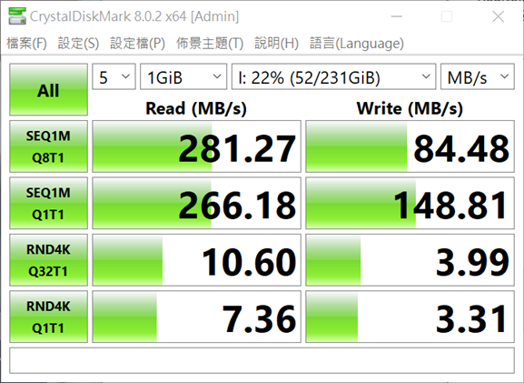 速度實測結果,可以看到完全沒有影響速度,完整發揮 Thunderbolt 的高速傳輸