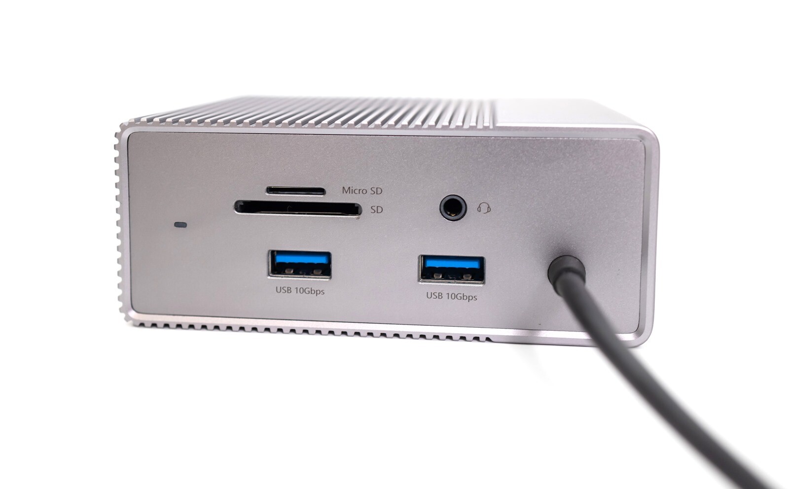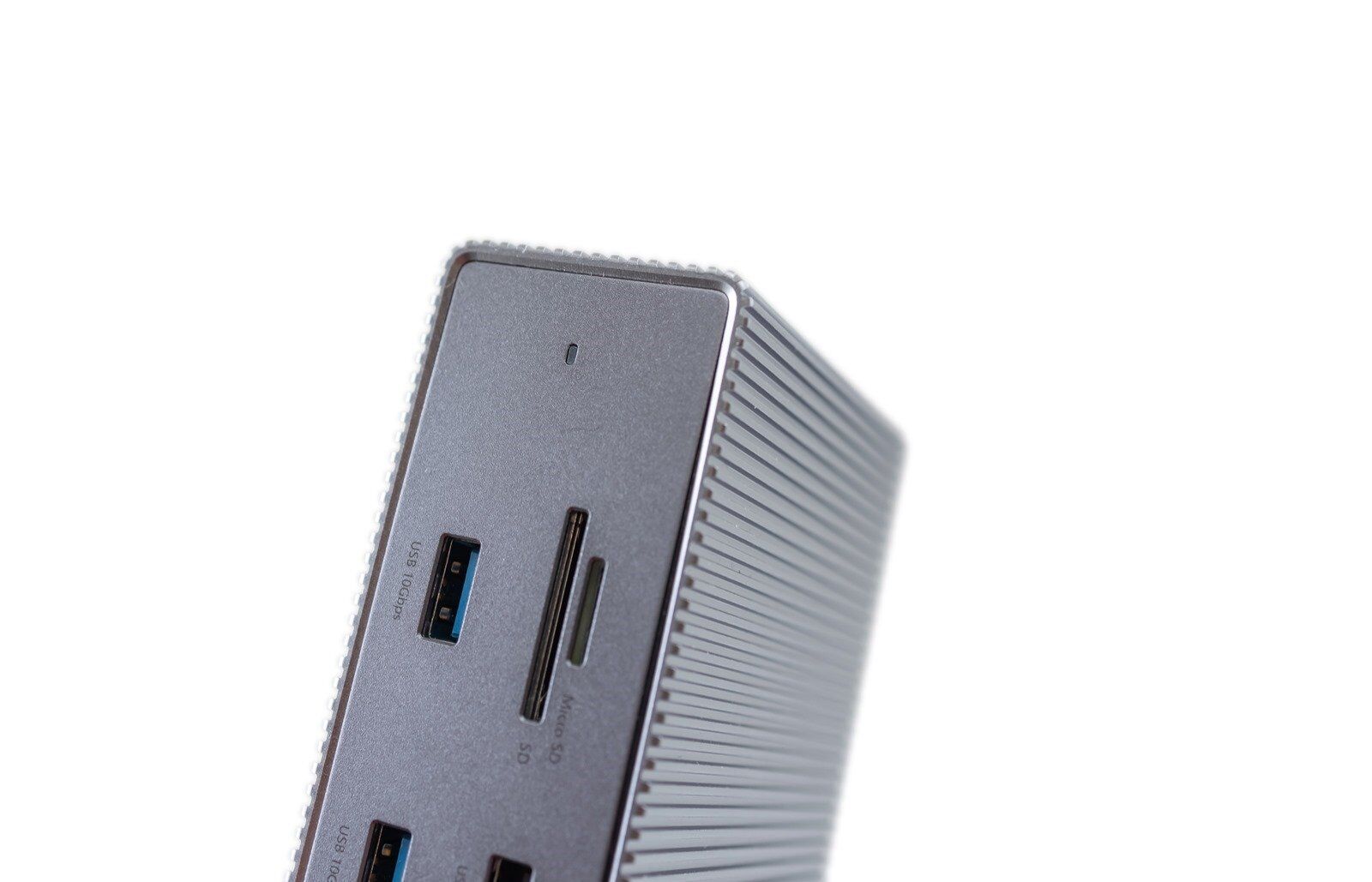 與 16 / 18 Port 不同的是 12 Port Gen2 USB-C Hub 應該是針對筆電使用為主要情境,電腦連接線是在機器的前方,旁邊有較為常用的兩組 USB 10Gbps 接口、 3.5mm 耳機麥克風接口,支援 USH-II 高速讀卡的 SD 4.0 / MicroSD 讀卡機。