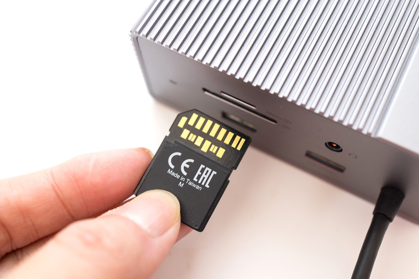 前方的 SD 4.0 /MircoSD 雙卡插槽讀卡機支援了 UHS-II 高速規則最高 312Mb/s 的超高速傳輸
