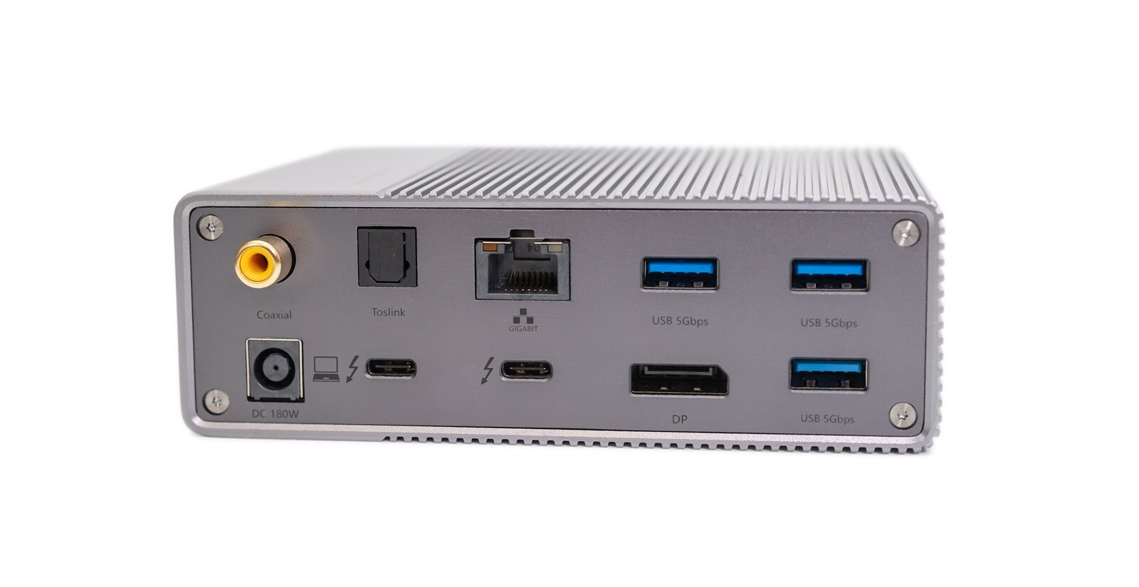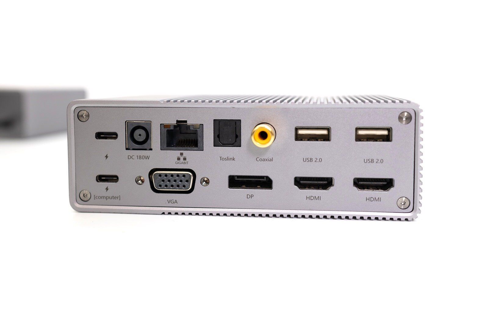 後方相比 12 Port 下更是完整,影音輸出除了兩組 HDMI 與一組 DP 之外還有比較傳統的 VGA 接口,不過老實說阿輝自己已經很久很久沒用過 VGA 了,大家還有在用 VGA 視訊嗎?18 Port Gen2 USB-C Hub 除了 12 Port Gen2 USB-C Hub 有的接口之外還有 SPDIF 數位音訊輸出與光纖輸出,另外就是除了可以連接 PD 100W 充電器之外,也可以另外連接 180W DC 變壓器(與 PD 充電器一樣都要另外購買),可以讓 18 Port Gen2 USB-C Hub 整體供電更充足,性能與穩定性都會有最好的表現。