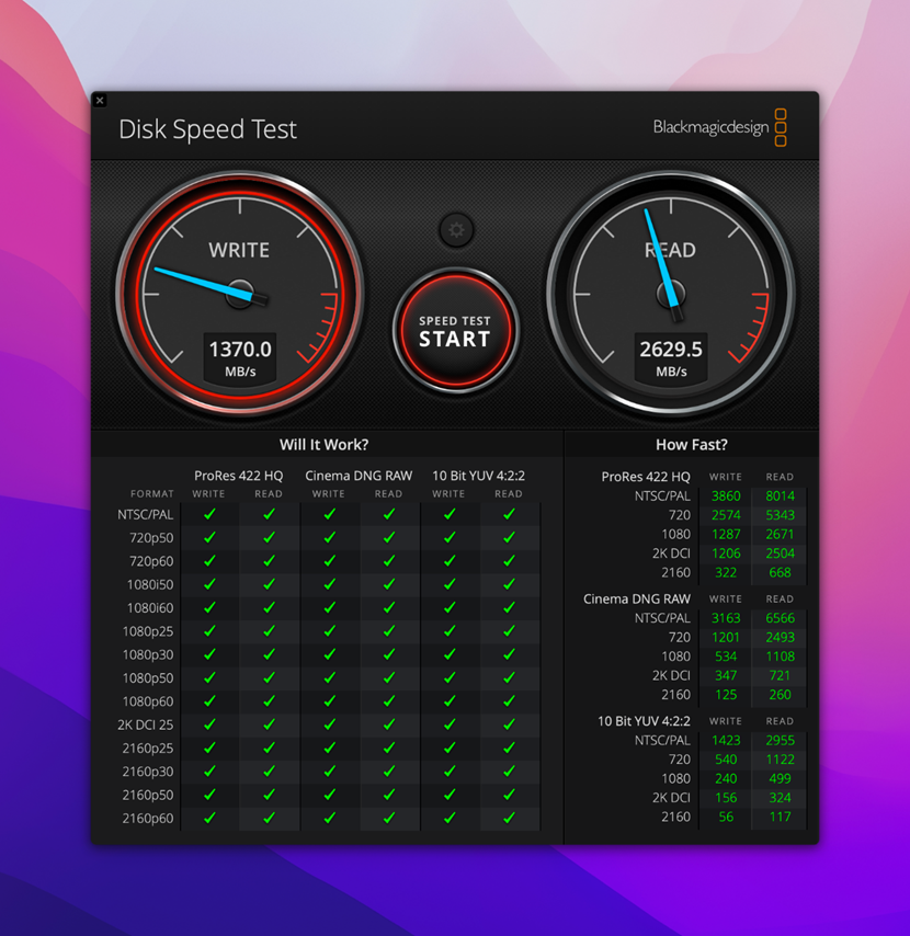 先測試 OWC Envoy Pro FX 直接連接到 M1 Macbook Pro 上測試,Thunderbolt 3 傳輸速度實在驚人啊!讀取約達到 2629MB/s,寫入也達到了 1370MB/se 驚人的成績,遠高於 USB 3.2 Gen 2 的極限 1000MB/sec!