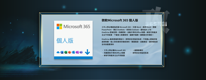 提供的內容是三個不同防護等級版本的卡巴斯基防毒軟體加上 Microsoft365 個人版的方案,除了以上介紹的卡巴斯基提供的防護內容以外,Microsoft365 的部份則是能夠跨五台不同裝置同步做使用,並且提供持續更新的進階版 Microsoft 軟體,常用的 WORD 和 PPT 也涵蓋其中另外還有 1TB OneDrive 雲端空間可以搭配用於做電腦的檔案資料備份儲存空間,並且提供有個人保存庫的雙重驗證跟自動鎖定功能。