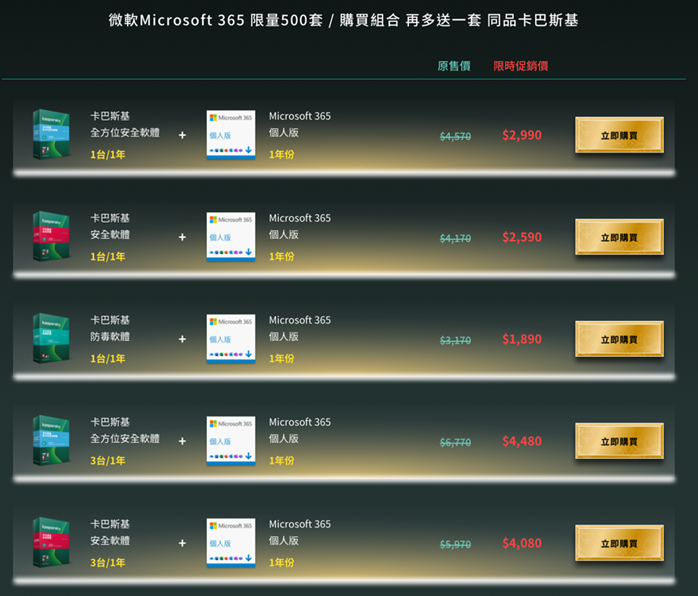 目前提供搭配微軟 Microsoft365 個人版與卡巴斯基的購買組合,還有再送一套同品的卡巴斯基。方案有 1 台裝置/1 年使用、和 3 台裝置/1 年使用的幾個不同方案搭配,只有一台電腦需要使用的人可以買一台裝置的版本,家裡有孩子、老婆各有各自的電腦的話也能購買 3 台裝置的 1 年版本大家可以這個網址進去展碁國際的網頁做購買https://lihi1.com/WPCr3,才會享有獨家代理商的售後服務喔。