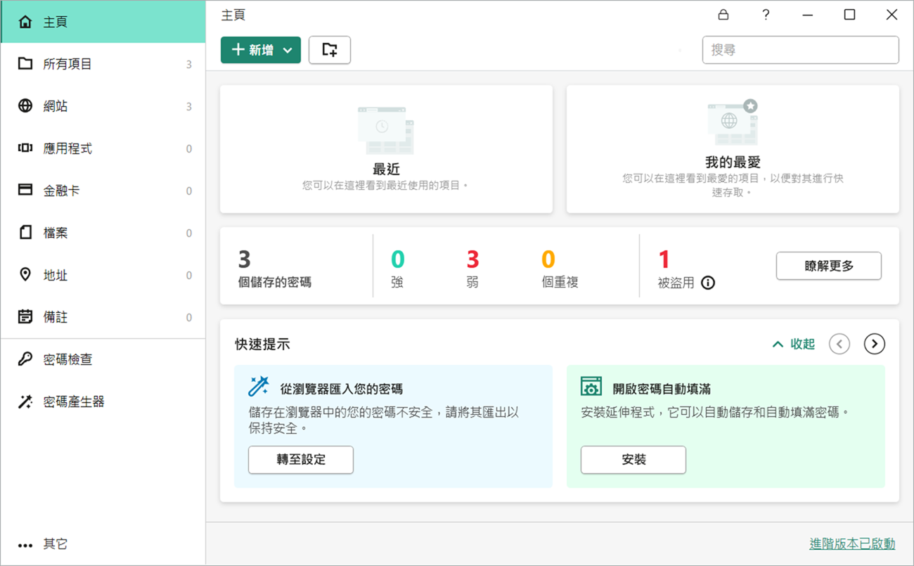 除了最重要的電腦主機本身反病毒防禦功能相當完善以外,Kaspersky 全方位安全軟體也有提供其它附加的網路使用需要的防護功能,不只能保護電腦檔案,也能在你使用網路其它功能的時候獲得防護,例如『密碼管理功能』,能夠透過卡巴斯基將你所有的 e-mail 、購物網站等等的登入密碼做儲存保護管理,只要設定一組在卡巴斯基的主密碼,就能管理所有透過電腦、手機、 iPad 裝置上的密碼,發生資料侵害的事件時也會提醒要做密碼更換。