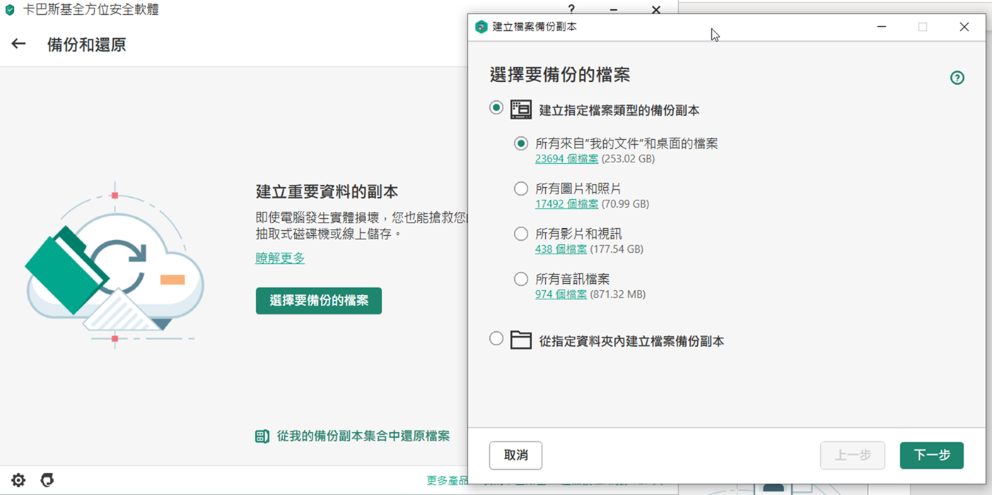 資料管理的部份也包含了備份和還原的功能,重要的檔案可以定期做備份,可以選擇存放在雲端資料夾、或者特定的本機資料夾以及 NAS 中,各種常用的備份空間都有做支援;並且除了備份檔案以外,也能再透過卡巴斯基做還原檔案的動作。