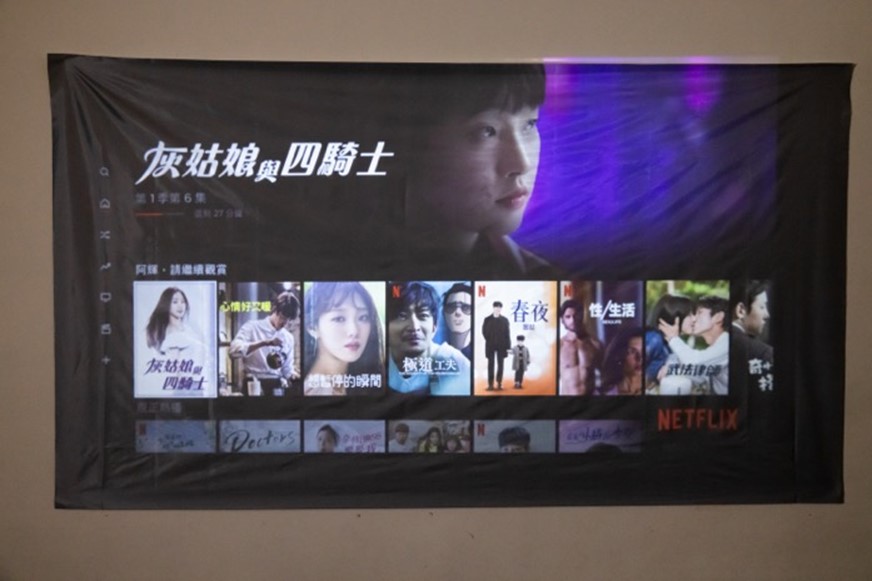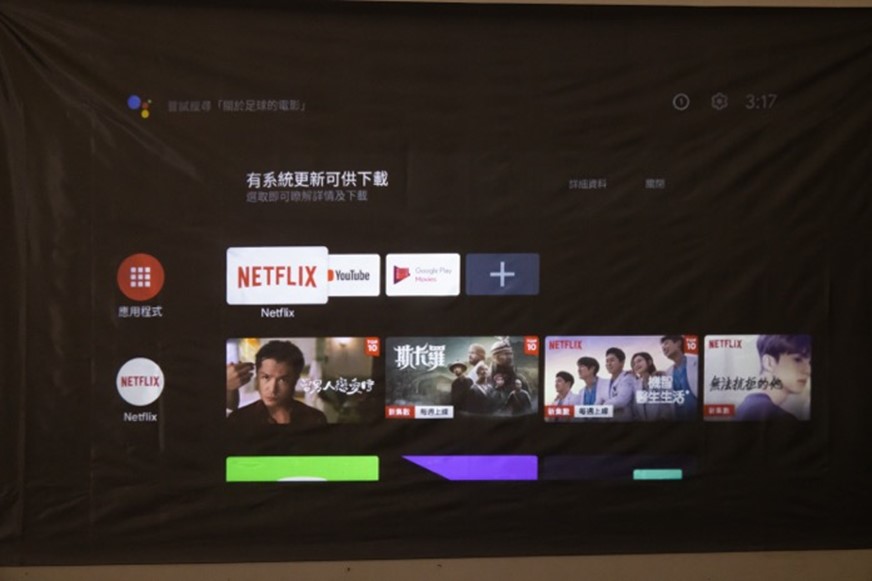 正如之前阿輝說的,市面上的投影機都沒有內建 Netflix 等播放平台,而這次的贈品正式授權電視盒中,就有直接內建一大堆!與電視盒連接後甚至連手機什麼都不用,直接播放連接電視盒之後就能收看、用遙控控制,跟打開電視一樣簡單,只不過比電視大很多,爽度也高多了!