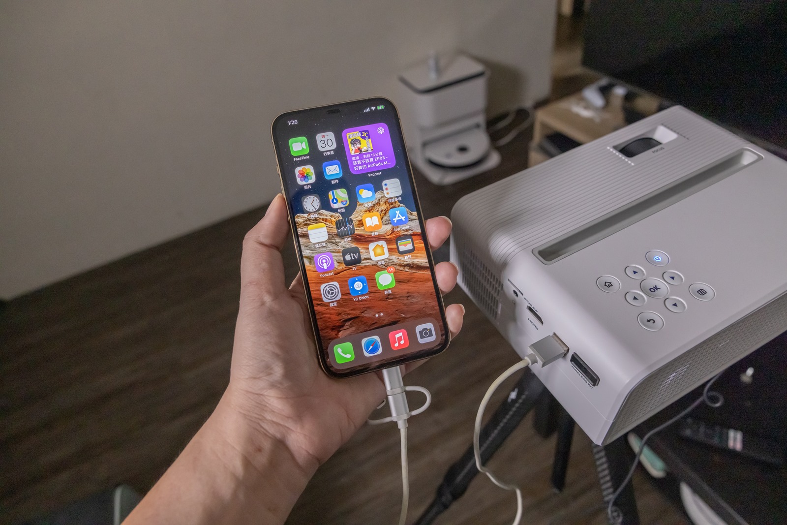 阿輝要在這邊告訴大家……iPhone 更方便,不用下載 APP 也不用什麼特殊方法或是念咒語,只要用傳輸線接上 ROLY M2+ 就可以直接投影。