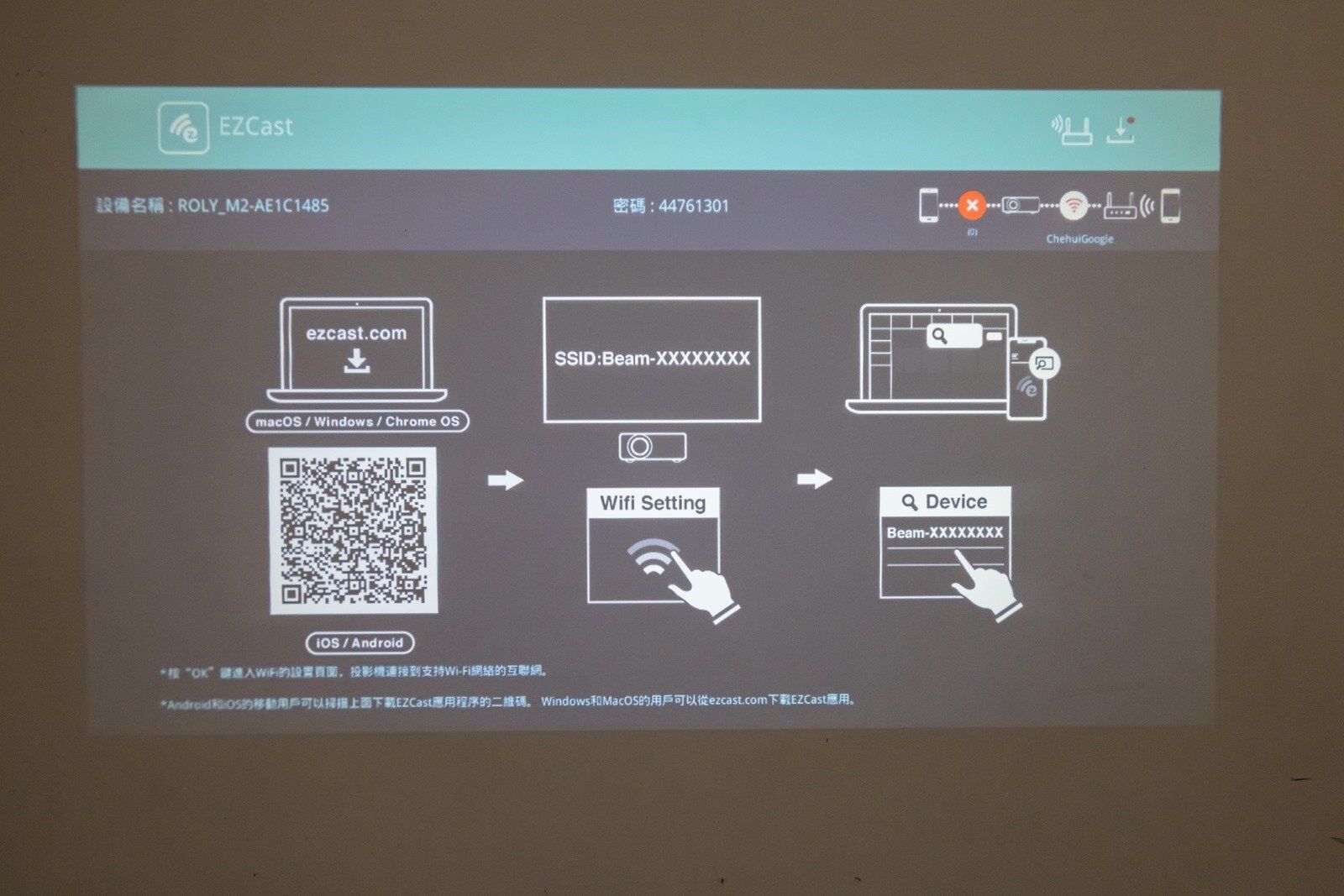 接著,要介紹的是 EZ Cast 連線方式,可以從 ROLY M2+ 的投影巨大教學畫面看出有多簡單。