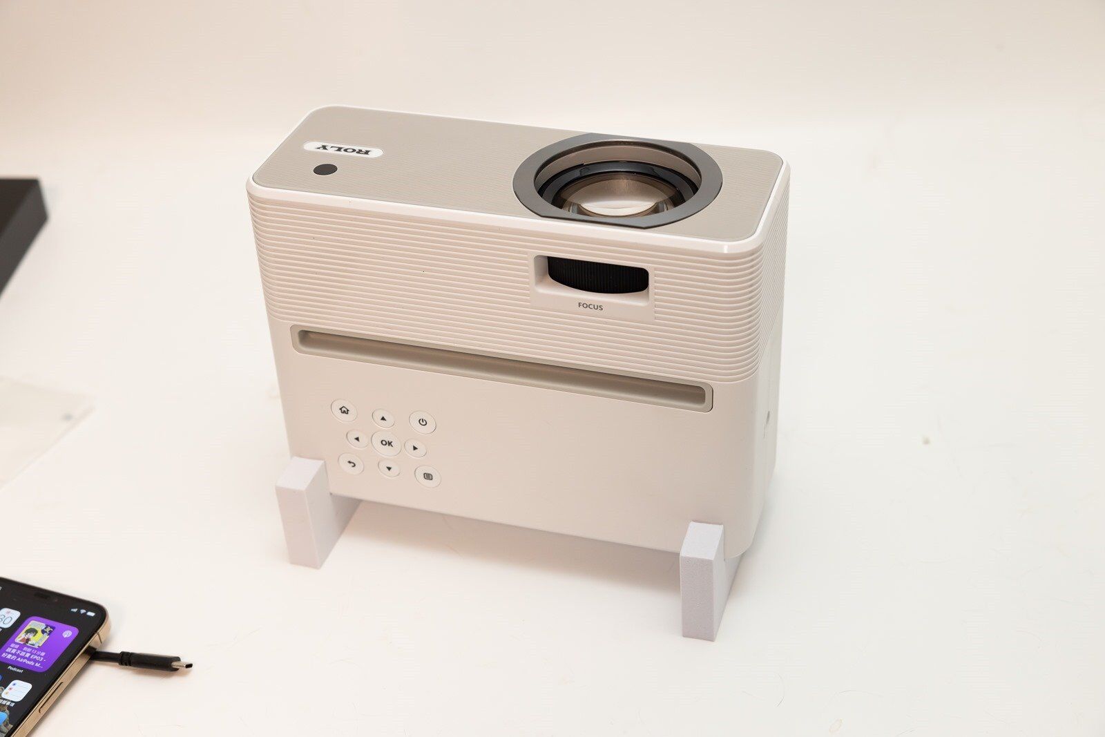 沒錯!它就是用來墊高 ROLY M2+ 的聰明小設計,可以讓它不只限於水平放置,稍微墊高,投影在較高的布幕或是牆壁上!真的是小組件大公用,這種巧思讓阿輝非常推崇。