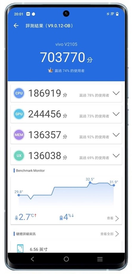 X70 Pro 採用 MTK 天璣 1200 處理器與 12GB 內建記憶體的規格配置,更多資料也可以阿輝資料庫 jK 內有大量阿輝多年測試手機/平板的實測數據,可以給大家作為對照參考使用。