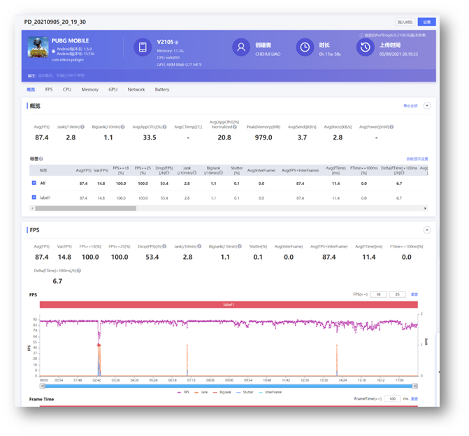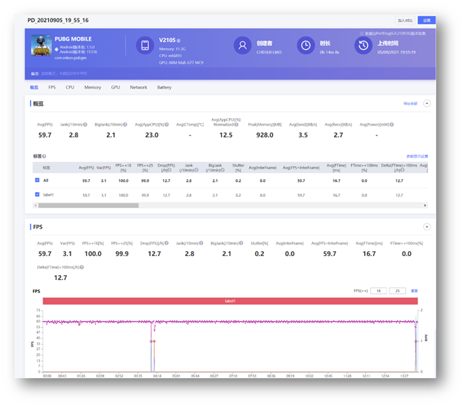 PUBG 開啟到 60fps 設定基本上也是小菜一碟,平均 59.7 fps,測試總時長 20 分鐘幾乎沒有任何掉張數的情形發生,全程幾乎都是滿幀數運行。