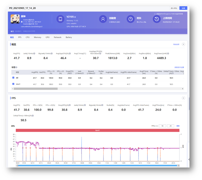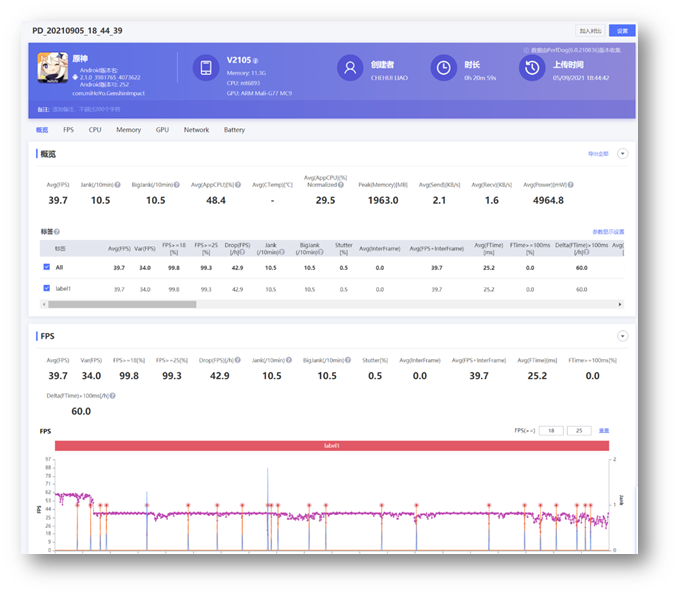預設中畫質 + 60fps 測試結果,似乎會有鎖張數的情況,大約執行 3 分鐘後執行上限為 40fps,不過整體測試感受非常順暢,測試曲線也幾乎是完全穩定的狀態