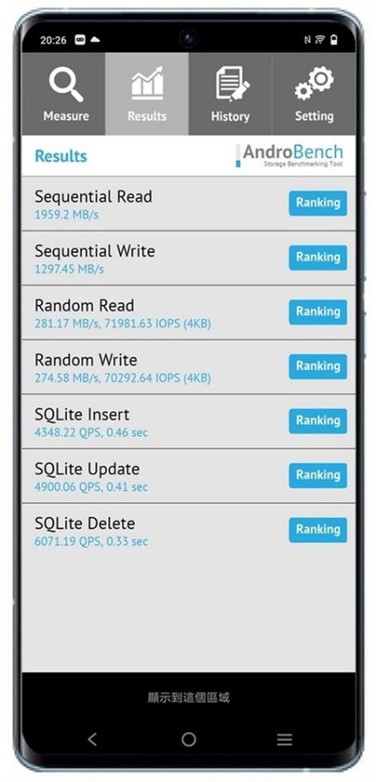 其實除了 CPU 處理器與記憶體,內建儲存空間的讀取/寫入速度也非常影響到日常使用的順暢度,這裡使用 AndroBench 實測讀寫速度,測得的結果為讀取 1959 MB/sec MB,寫入為 1297 MB/sec