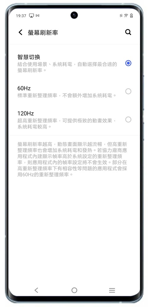 現今旗艦機重點的高更新率顯示,X70 Pro 自然也支援 120Hz 高更新率與 240Hz 觸控取樣,無論日常操作還是遊戲影片,都是最強順暢表現,同時也可以在設定中選擇 120Hz/60Hz 或是自動切換,其實這裡 vivo X70 Pro 在電力續航方面的表現非常優異幾乎可以說大家就直接開自動切換或是 120Hz 都不用擔心電力問題,稍後電力部分會有實測數據給大家參考