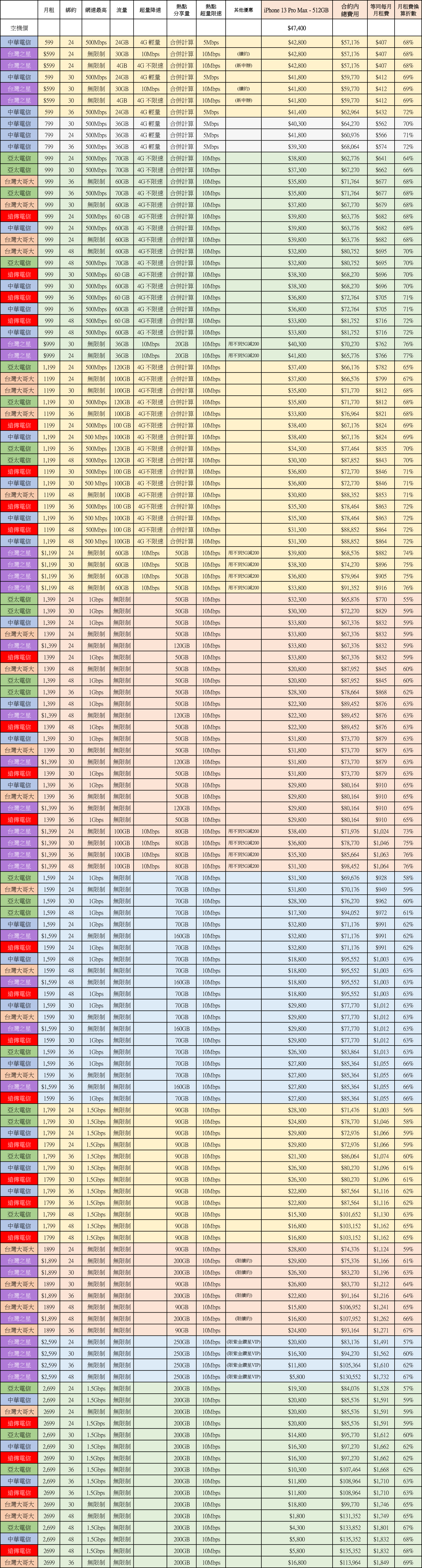 - 再依照『自己每月常用的月租費規模』來看表格分段,同接近月租費區段會用同顏色顯示,基本上可以簡單說明在接近價位帶的狀況,越上方可以作為為越划算(較優秀)