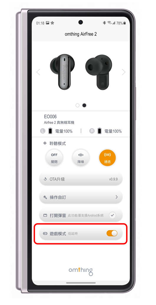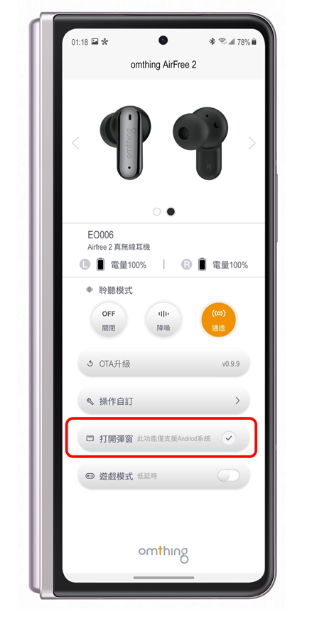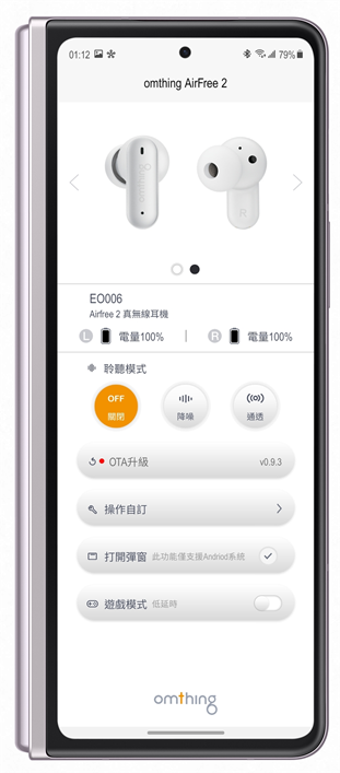 只要第一次使用時先設定好連接,每次打開蓋子就可以自動配對,連接方式也很簡單,只要先下載 omthing APP,找到 AirFree 2 耳機,就可以輕鬆按照步驟配對,在每一次打開 AirFree 2 蓋子取出耳機時,手機上也會自動彈出目前耳機與電池盒的剩餘電量
