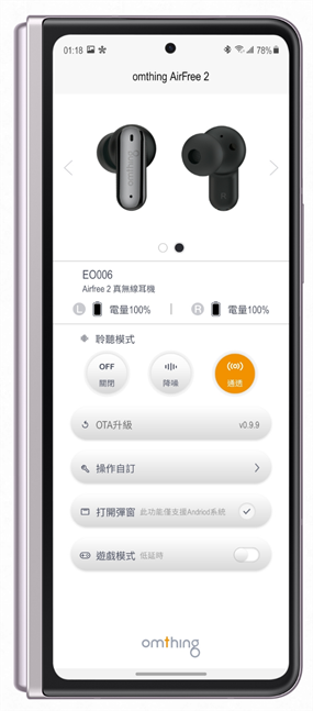 AirFree 2 也可以設定選擇降噪模式的開關,聆聽模式的切換,有 APP 使用上還是比較加分;這裡也可以發現 AirFree 2 在 APP 中可以直接觀看電量 / 升級耳機韌體等功能。