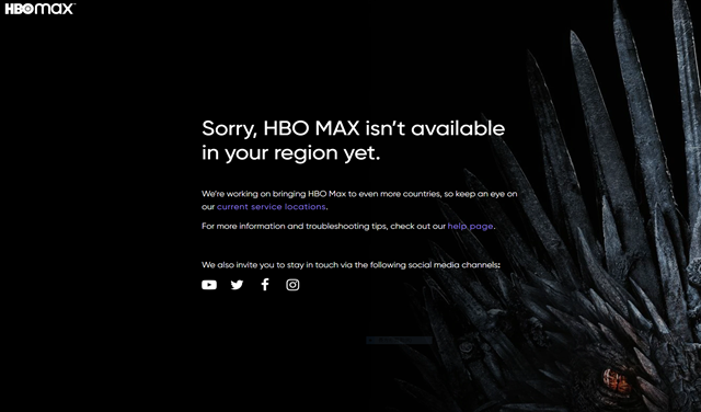 除了 Netflix 跨區,更可以購買觀看目前台灣都還不能觀看的 HBOMax,你只要在 Google 搜尋 HBOMax 在台灣就只會出現這個網站畫面,完全沒有畫面