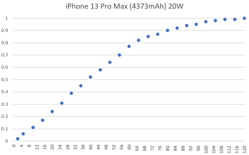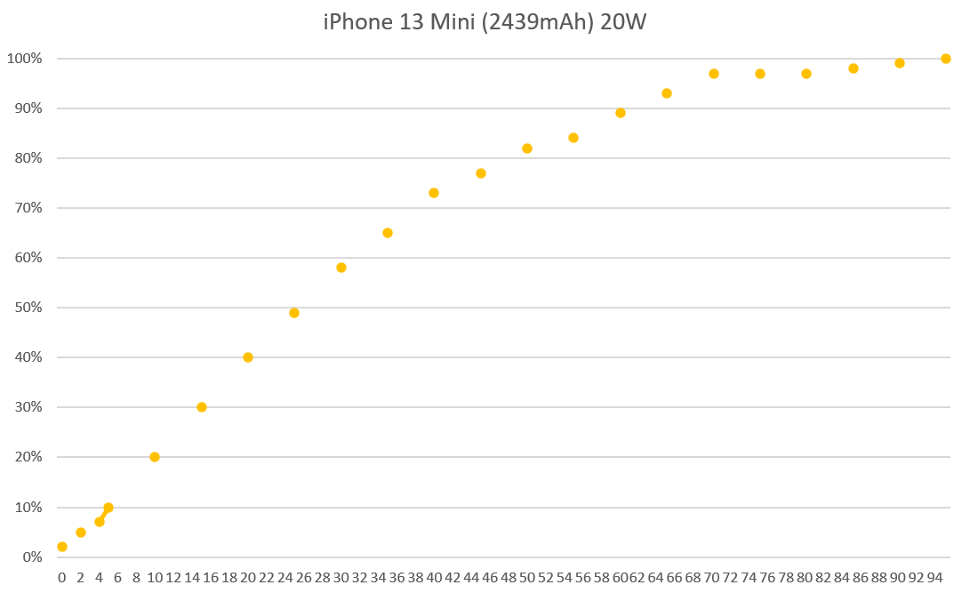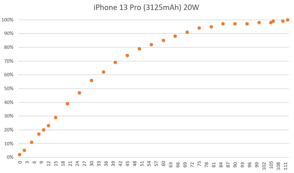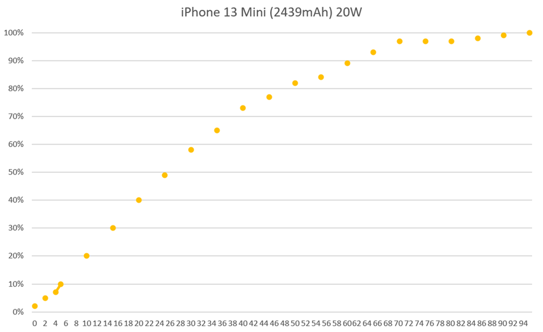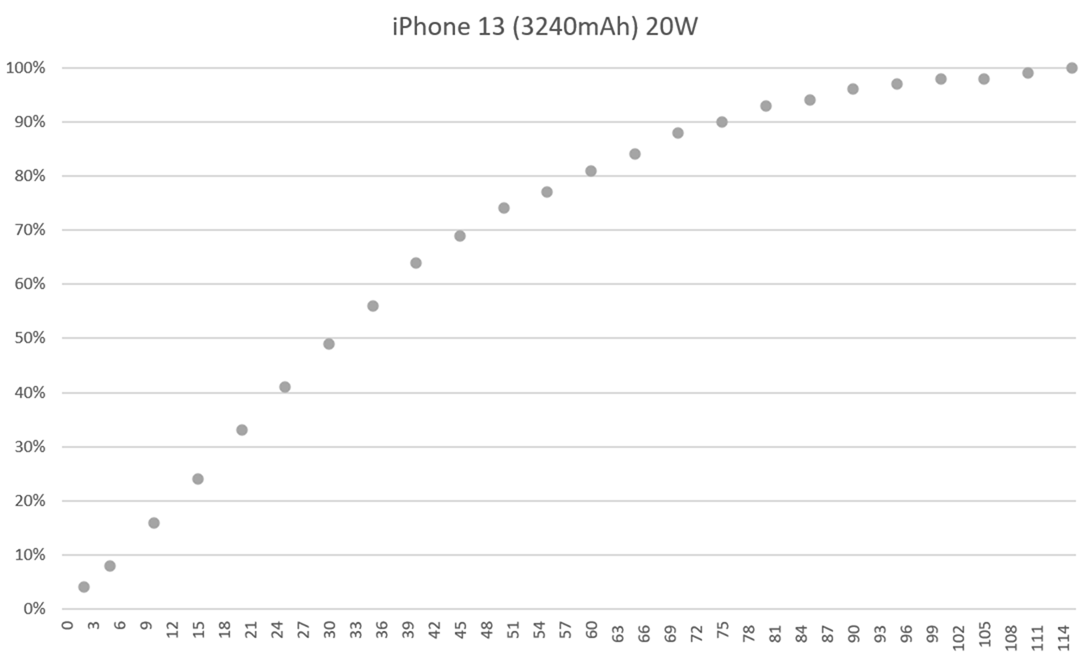 電力續行測試之後,也將 iPhone 13 Mini / iPhone 13 / iPhone 13 Pro / iPhone 13 Pro Max 四台機器全部的充電時間也測試與記錄完畢,完整表單也可以參考彙整的資料表格,iOS 上因為目前沒有比較適合的紀錄工具,因此採用手動記錄,記錄間隔為 5 分鐘一次記錄並繪製圖表。