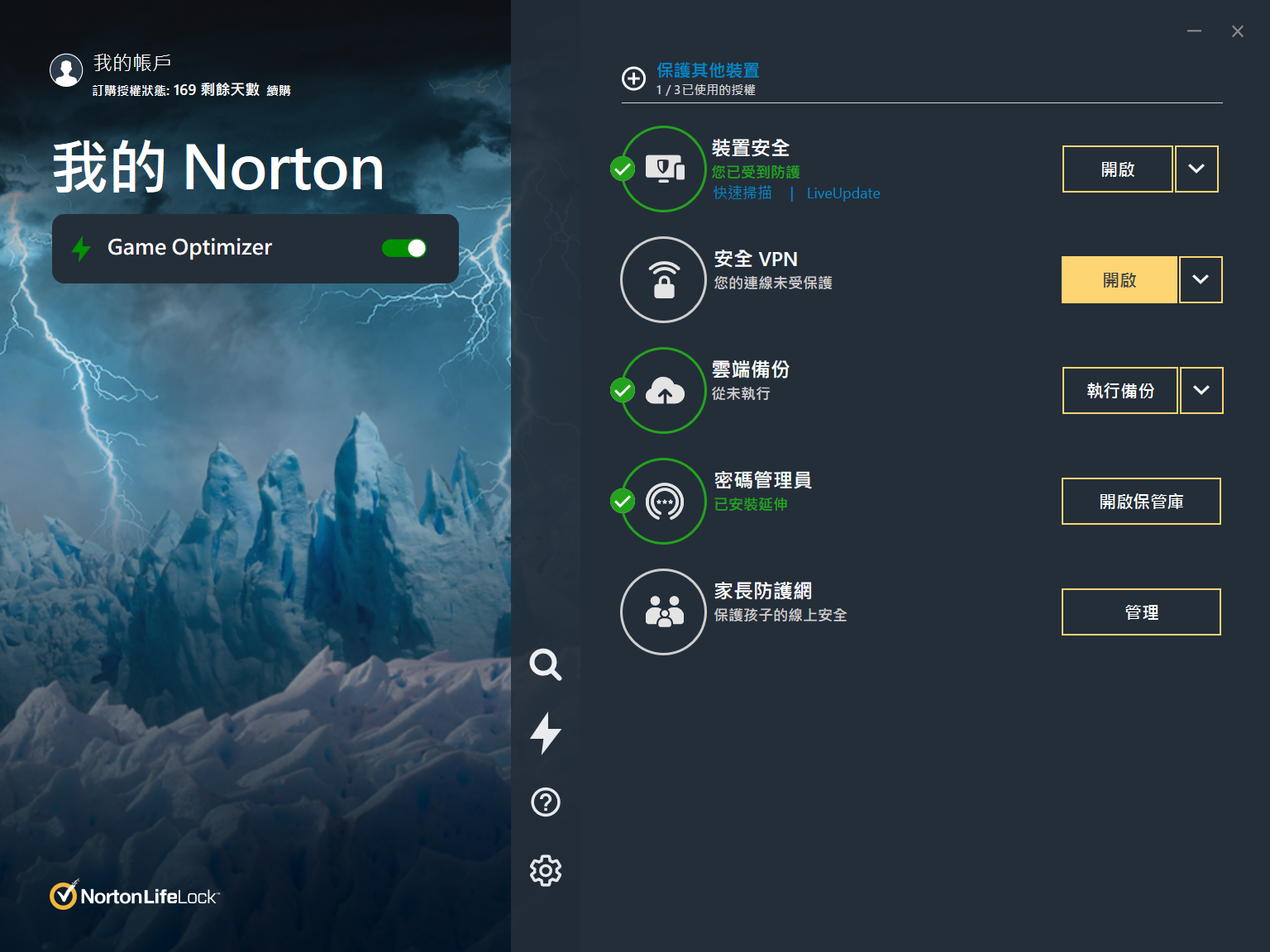 Norton 360 電競版也都有支援多國語言介面,當然繁體中文也是一定要的,另外也要特別說一下 Norton 360 電競版現在程式的介面非常簡潔與人性化,幾乎沒有生硬的電腦程式感覺;面板上功能要開啟關閉也非常簡單,左側也可以看到 Norton 360 電競版最重要的 Game Optimizer 遊戲最佳化功能的快速開關