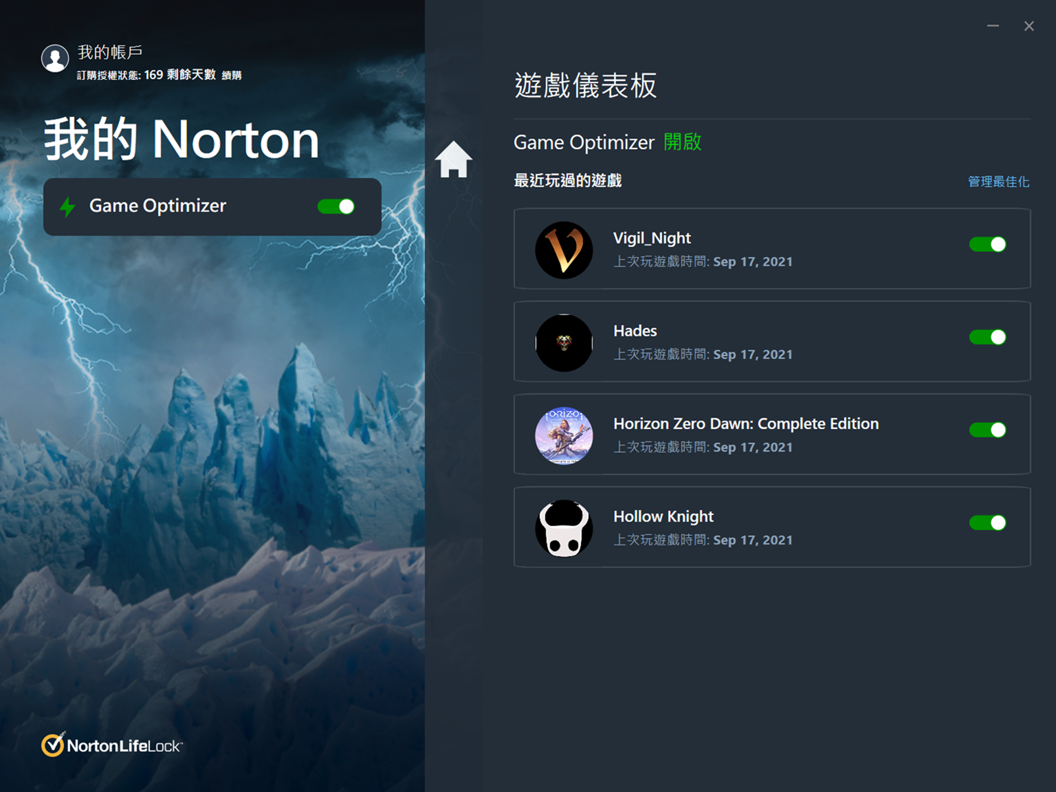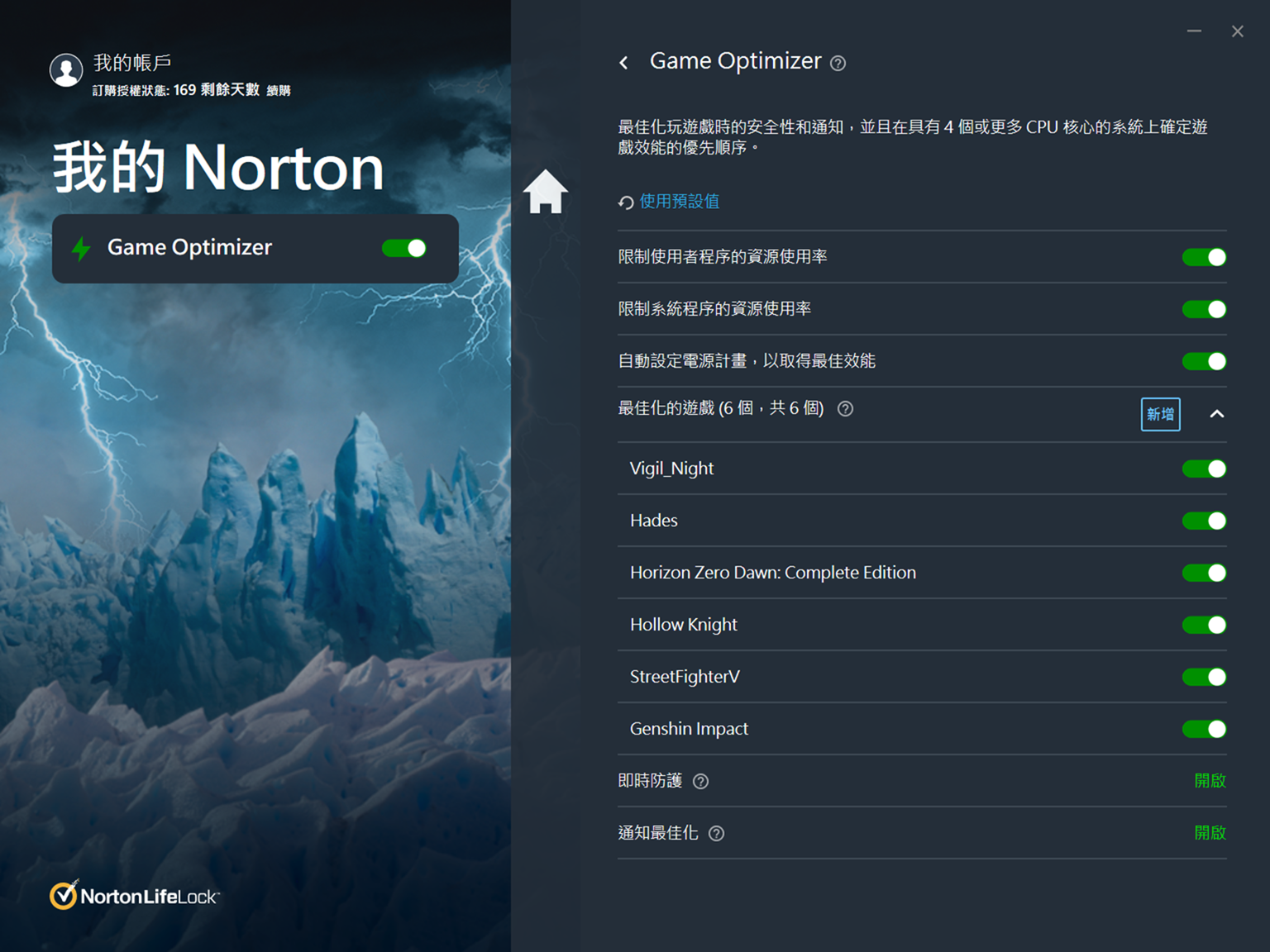 Norton 360 電競版最大的重點自然就是為了遊戲最佳化的性能與設計,點選面板中的閃電圖示就可以切換到遊戲儀表版,這裡 Norton 360 電競版也會列出最近玩過的四個遊戲,最佳化功能也可依照自己的需求隨時開啟或是關閉!至於 Norton 360 電競版提供了哪些功能我們繼續看下去