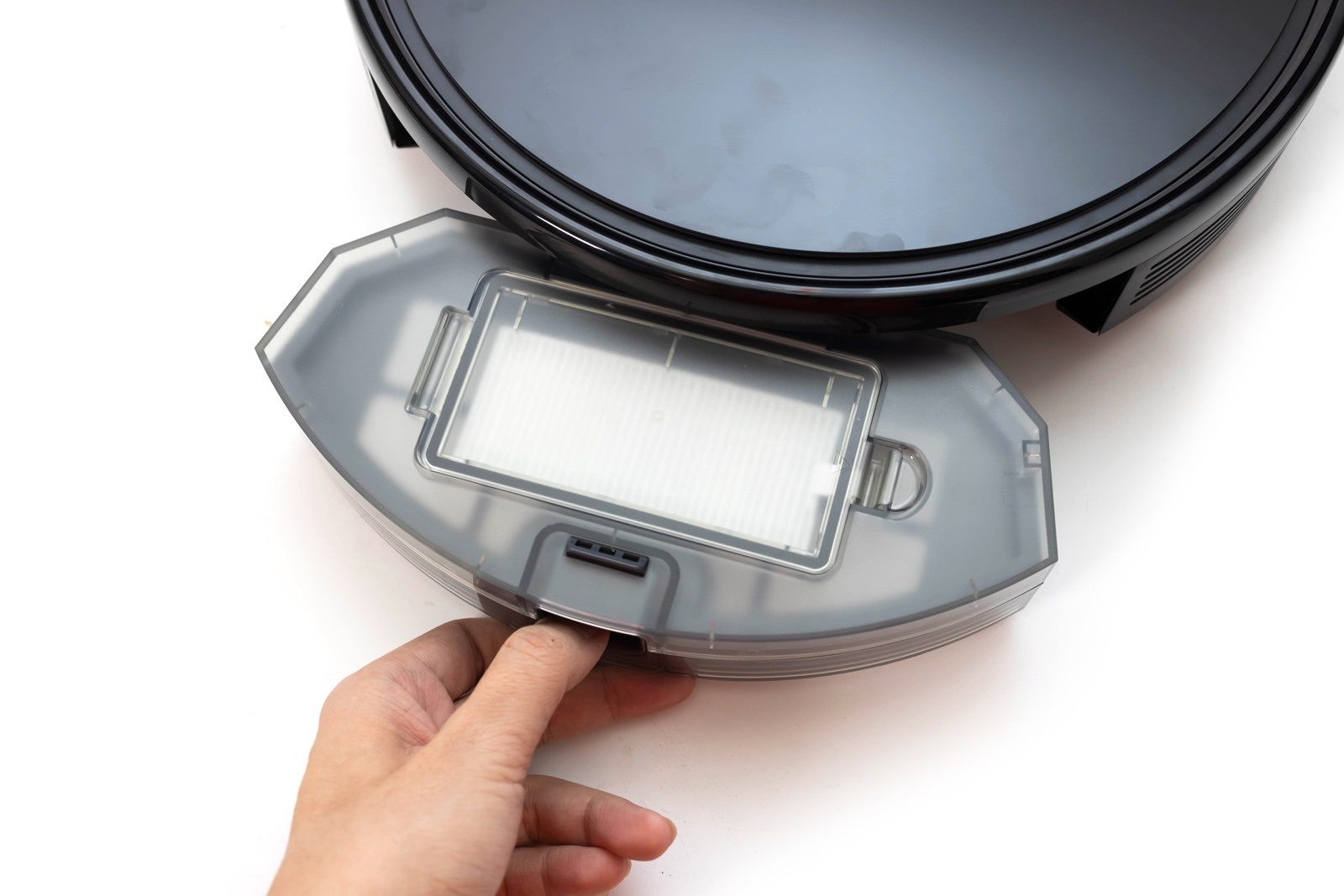 打開集塵盒就能看到 HEPA 濾網,小黑洞選用的是可水洗的 HEPA 濾網,同時兼顧使用掃拖機器人時的空氣品質以及環保,讓掃除中與清掃後不只地面乾淨連空氣也是純淨的,而且髒了還可以水洗,不只是節約耗材保護地球,也能守護使用者的荷包。想取出 HEPA 濾網很簡單,只要拿出集塵盒就可以看到它躺在裡面,只需要輕輕挑開上層卡扣就可以打開蓋子,取出集塵盒。