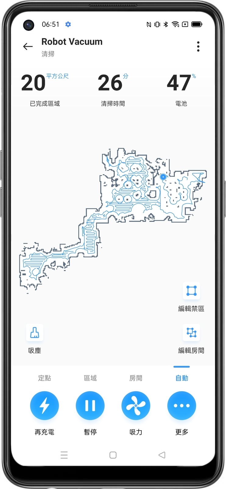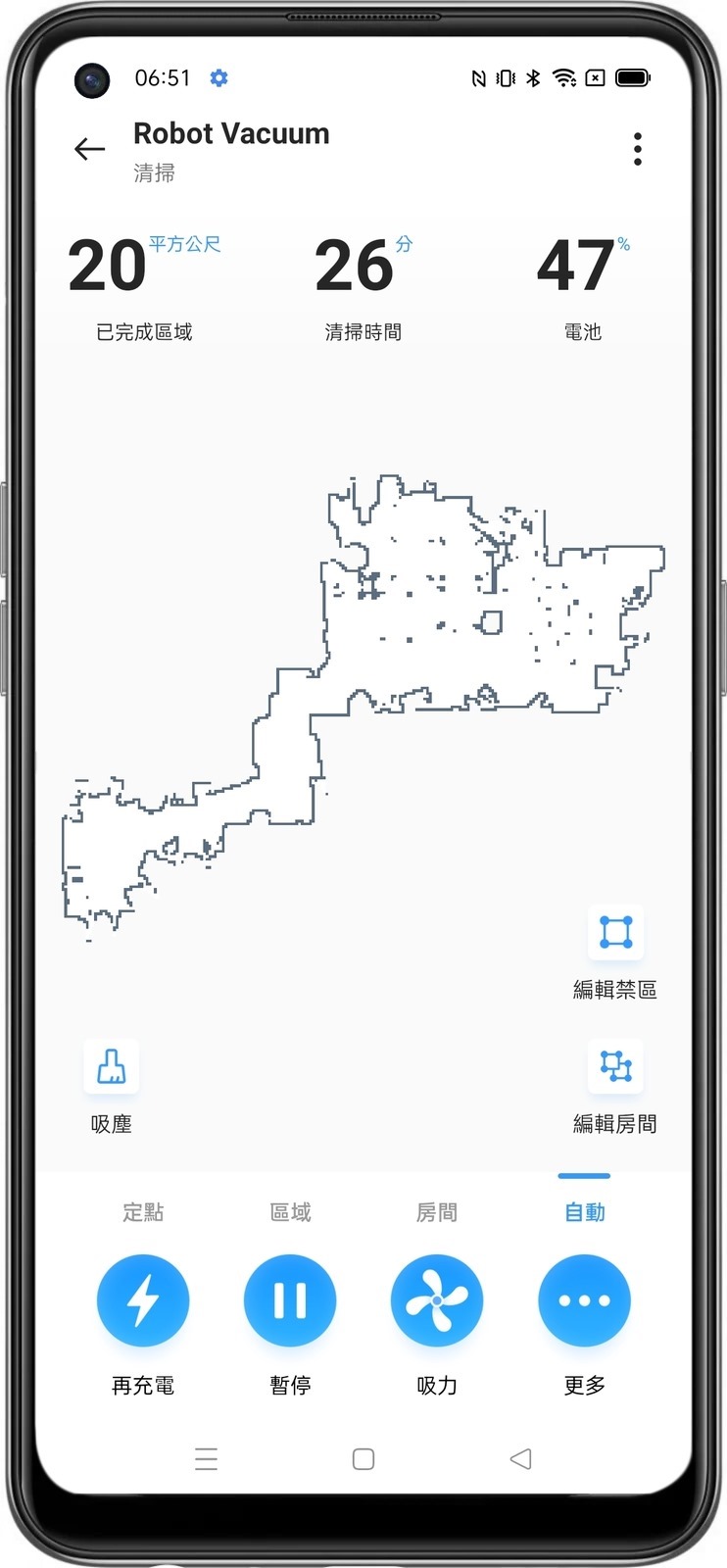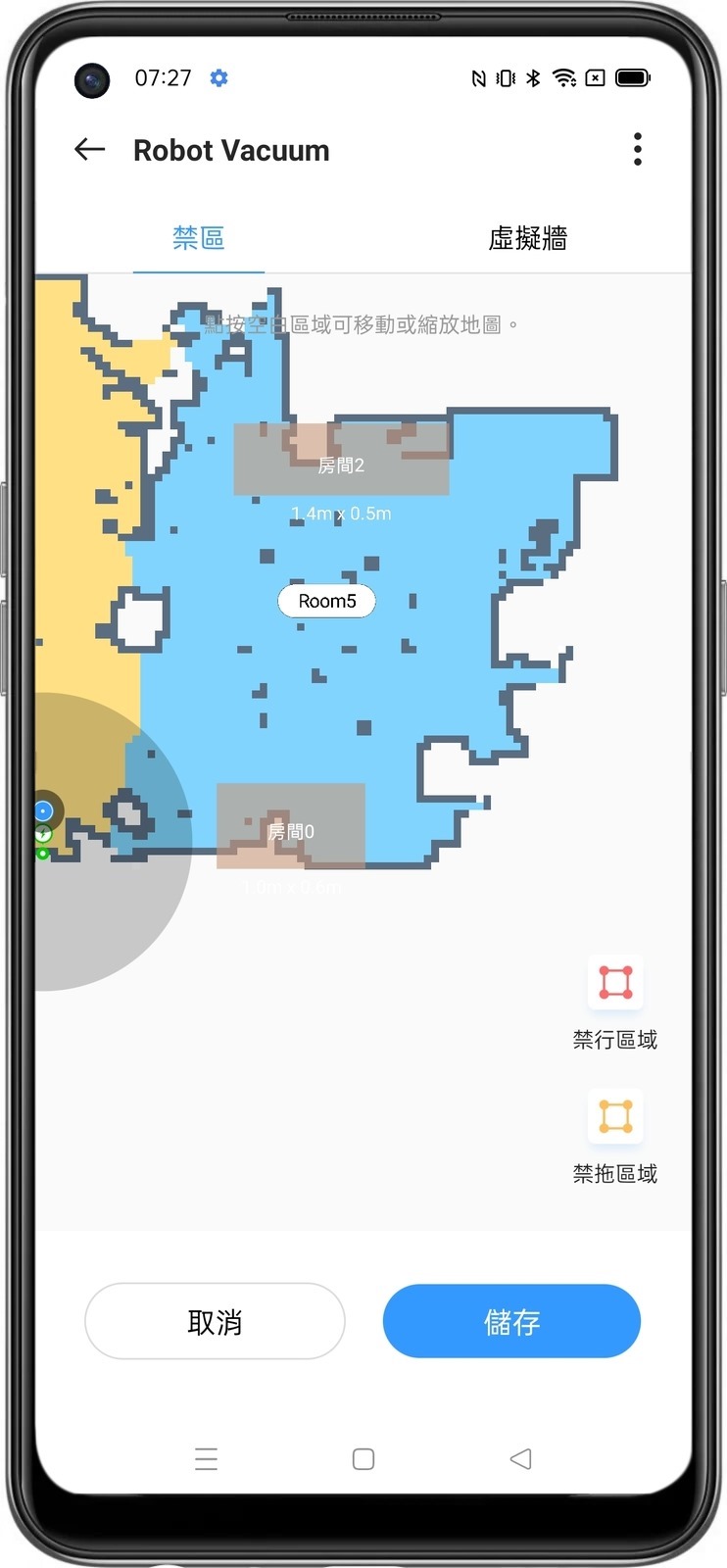 一台小黑洞最高可記錄 5 張地圖,並可以設定虛擬牆與設定禁掃區域,設定方式也很簡單,就是按下螢幕中的禁行或是禁拖區域,然後在地圖上直接框選就好。比方說阿輝家有養貓,貓咪的水碗就是一個絕對禁區!