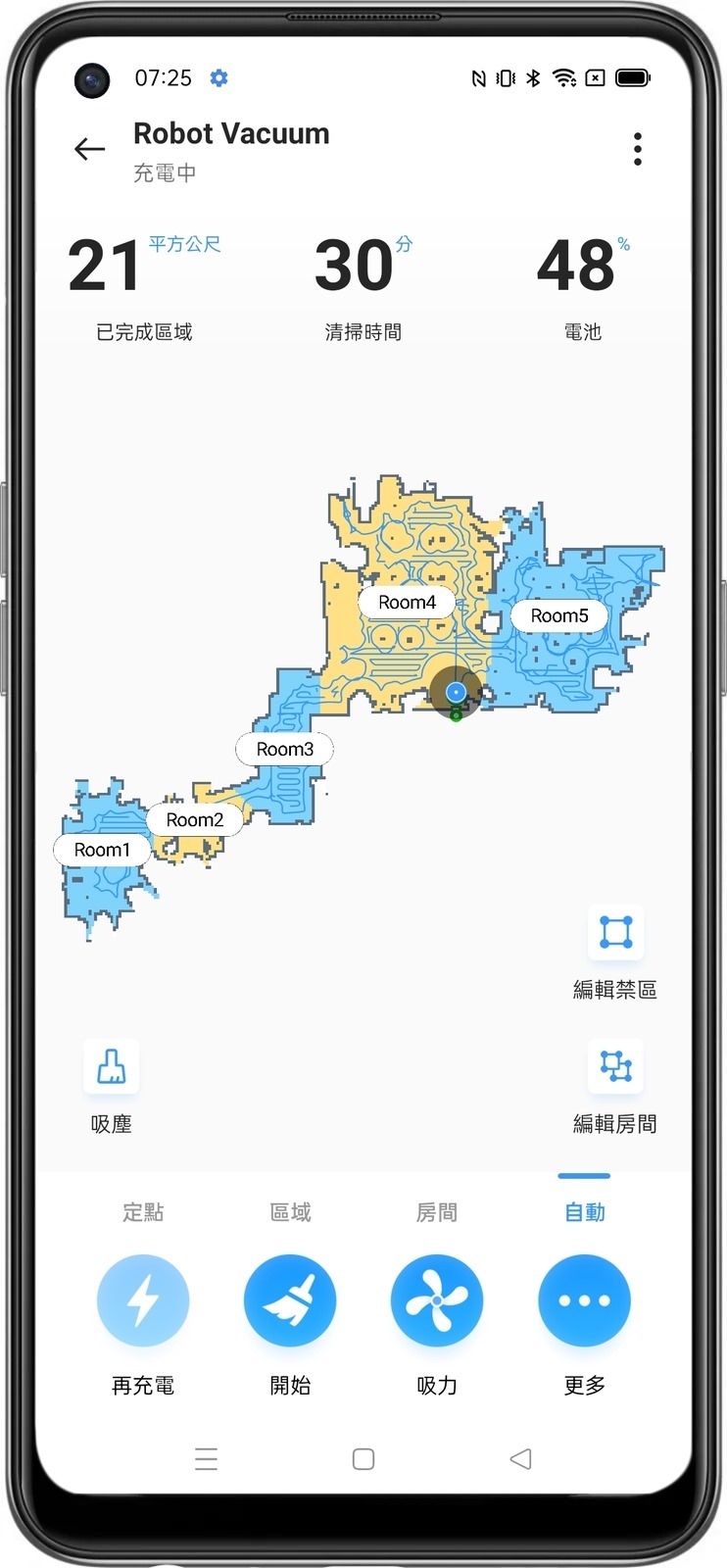 機器人會在清掃過程中,繪製出居家環境的格局與樣貌,當然跑一趟路做完盡可能多的事情,是最符合經濟效益的!所以清掃後不僅繪製好地圖,同時也已經記錄這一次的清掃資料與模式了。