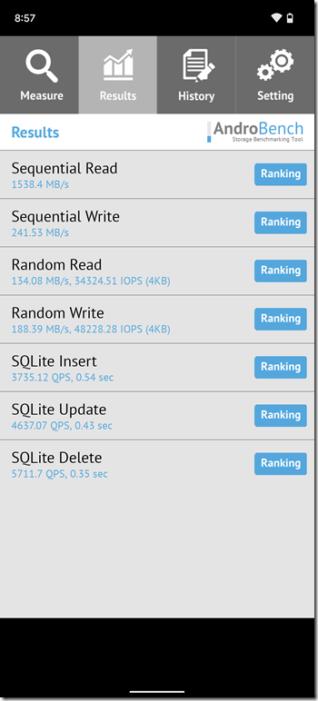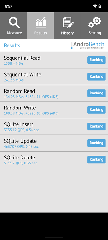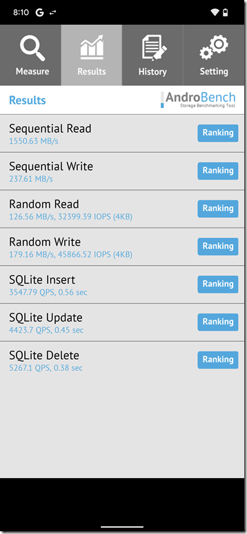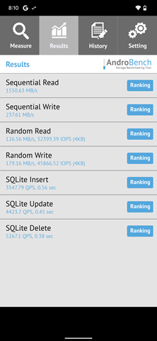 其實除了 CPU 處理器與記憶體,內建儲存空間的讀取/寫入速度也非常影響到日常使用的順暢度,這裡使用 AndroBench 實測讀寫速度