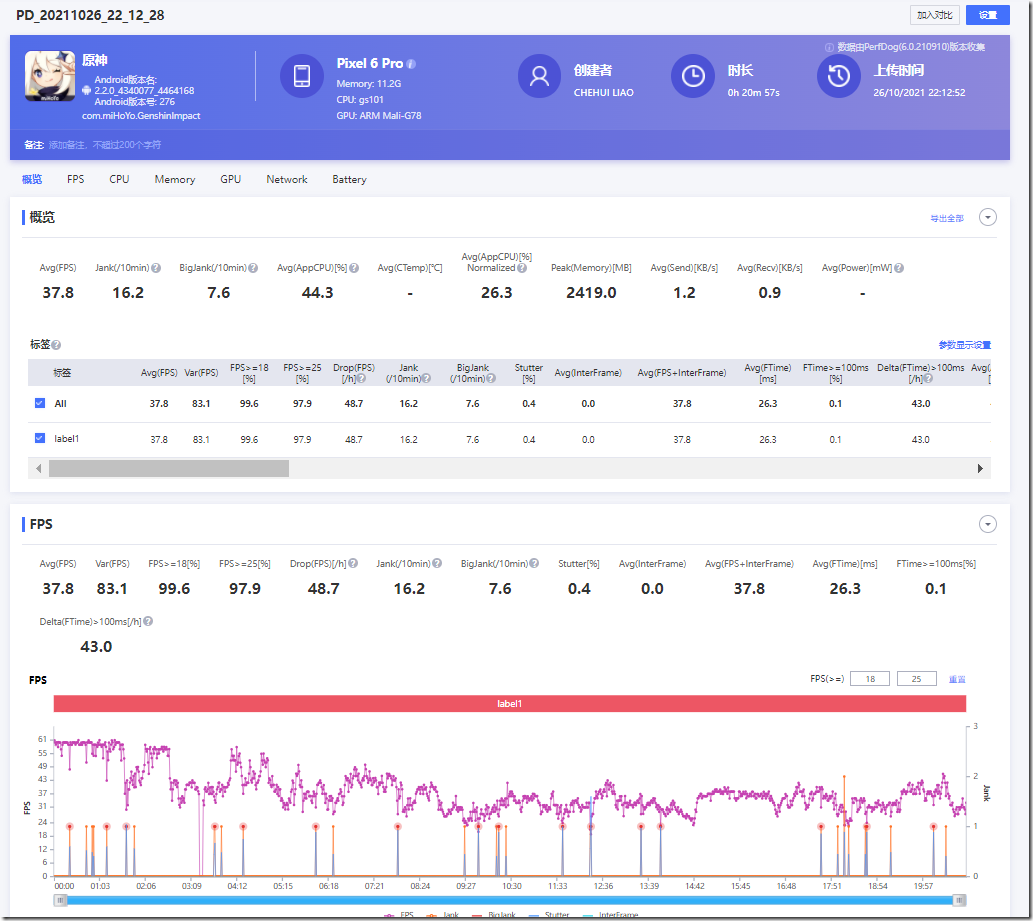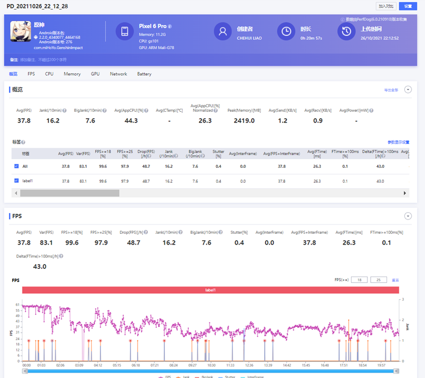 以中畫質運行 20 分鐘似乎表現沒有很好,平均張數 37.8 fps,一開始 60FPS 大約三分鐘後就開始有降頻情況,不過實際原神運行中遊戲也有聲音破碎的情形,也有可能是原神與 Tensor 處理器還有相容性問題?