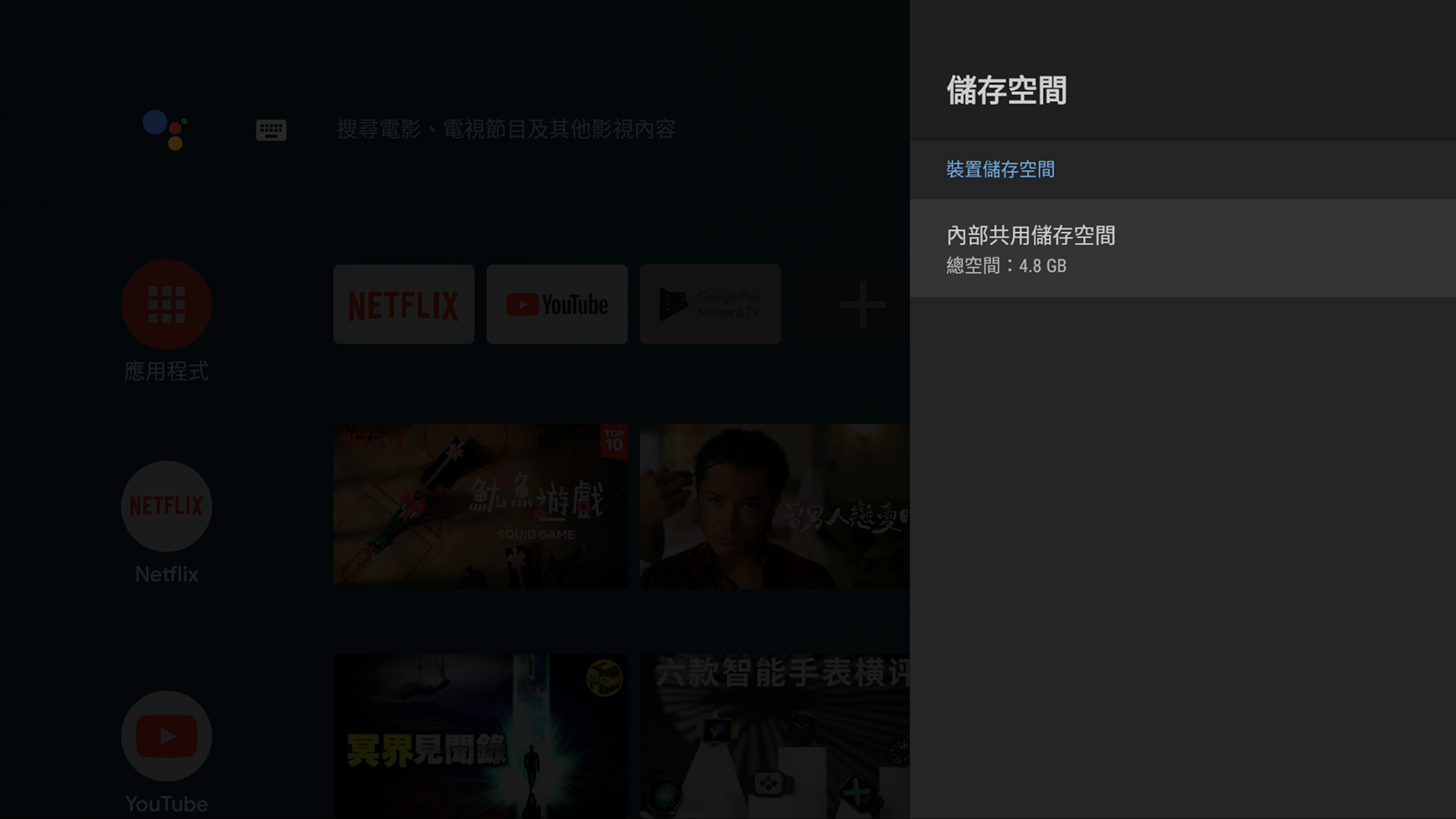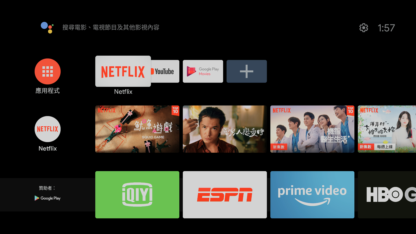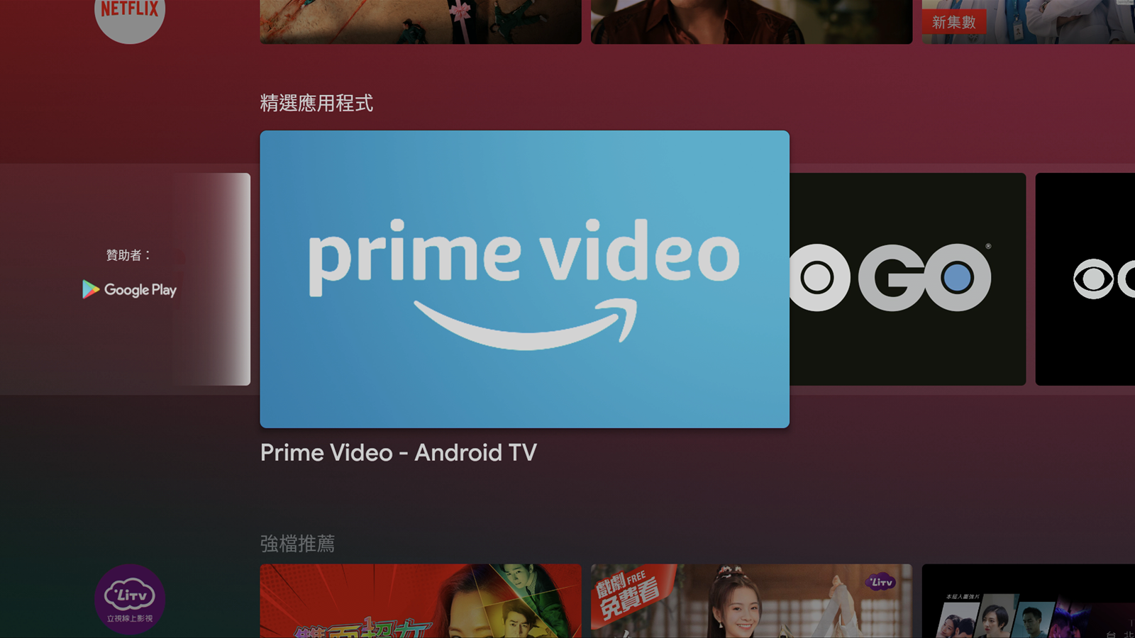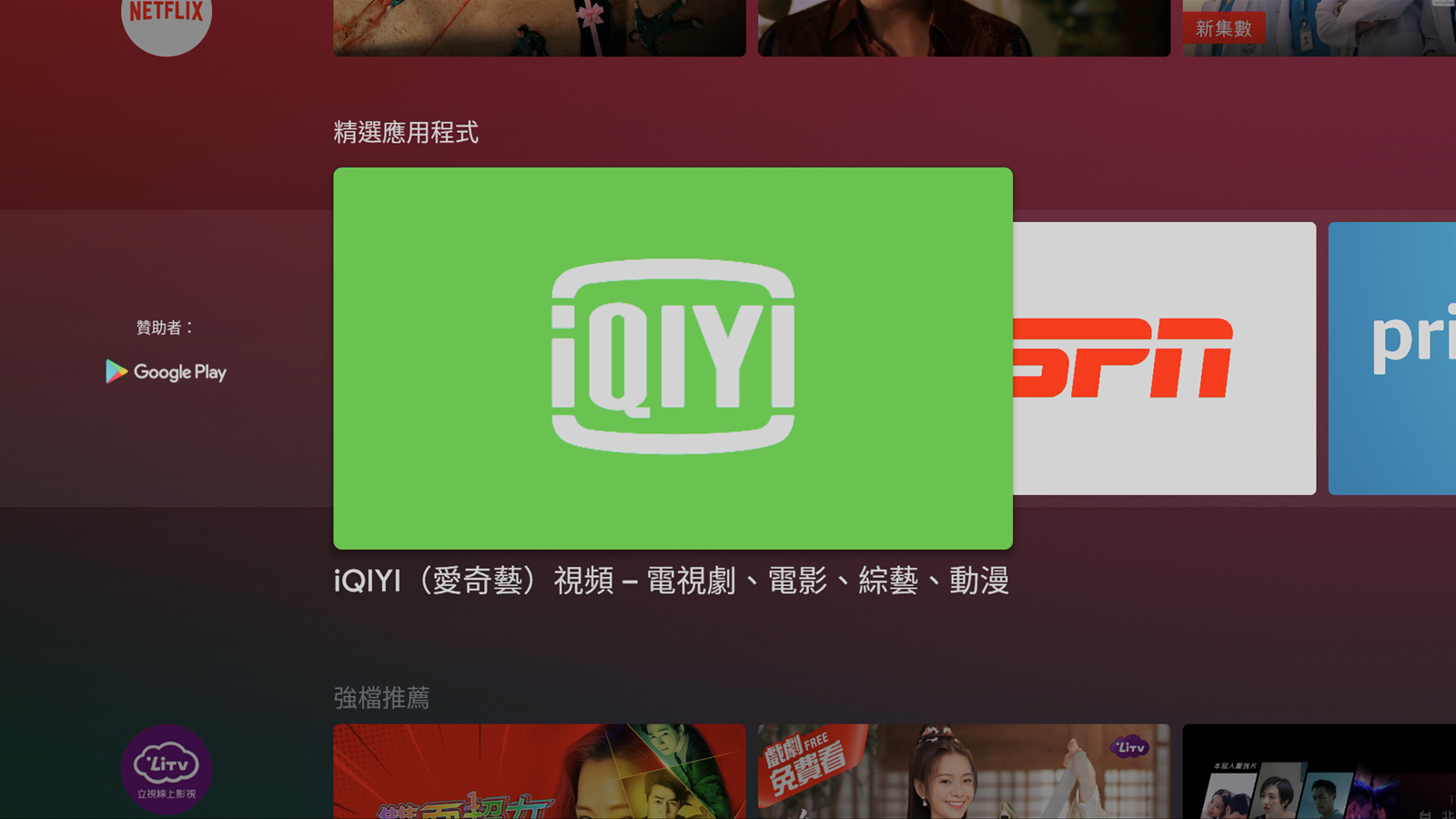 一開機之後的主要介面中,就會顯示出一般常用的影像串流平台,像是內建的 Netflix 跟 Youtube 等等,也有推薦使用者可以從 Google Play 下載其他應用程式,像是愛奇藝等等,會出現在推薦的應用程式中,使用者可以不必自己鍵入搜尋,直接在精選中尋找就好。