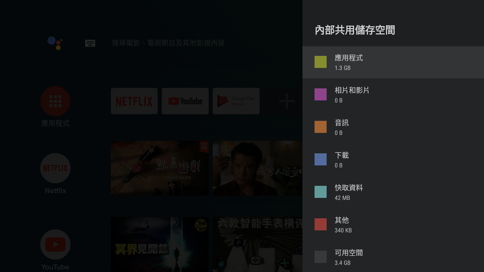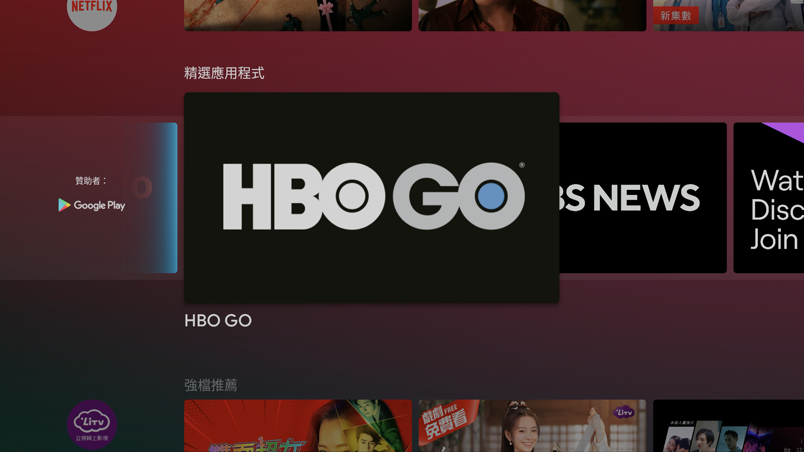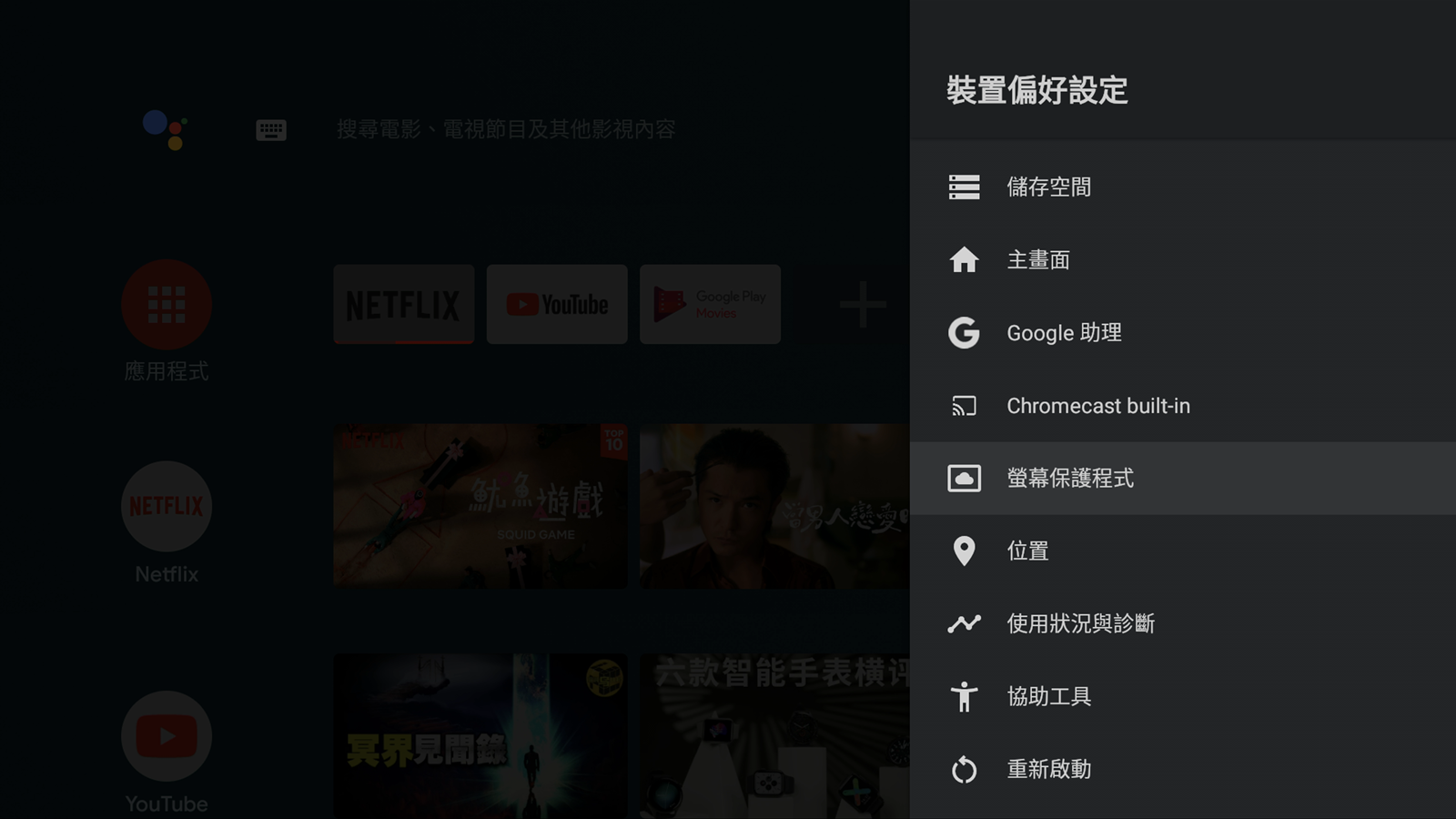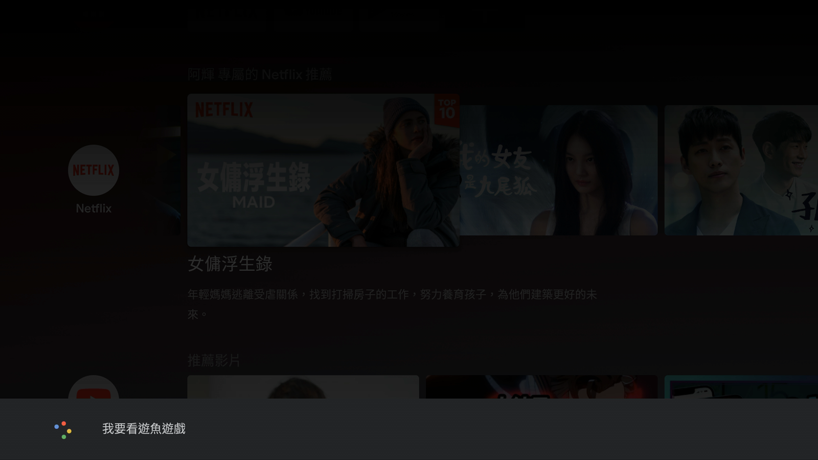 一開機之後的主要介面中,就會顯示出一般常用的影像串流平台,像是內建的 Netflix 跟 Youtube 等等,也有推薦使用者可以從 Google Play 下載其他應用程式,像是愛奇藝等等,會出現在推薦的應用程式中,使用者可以不必自己鍵入搜尋,直接在精選中尋找就好。