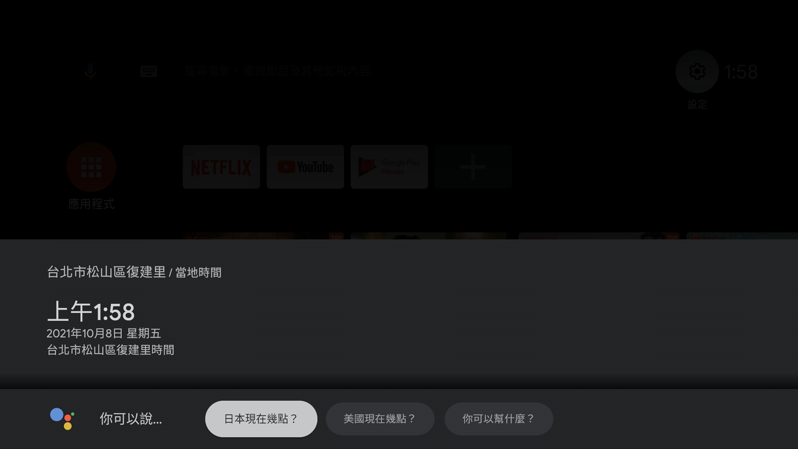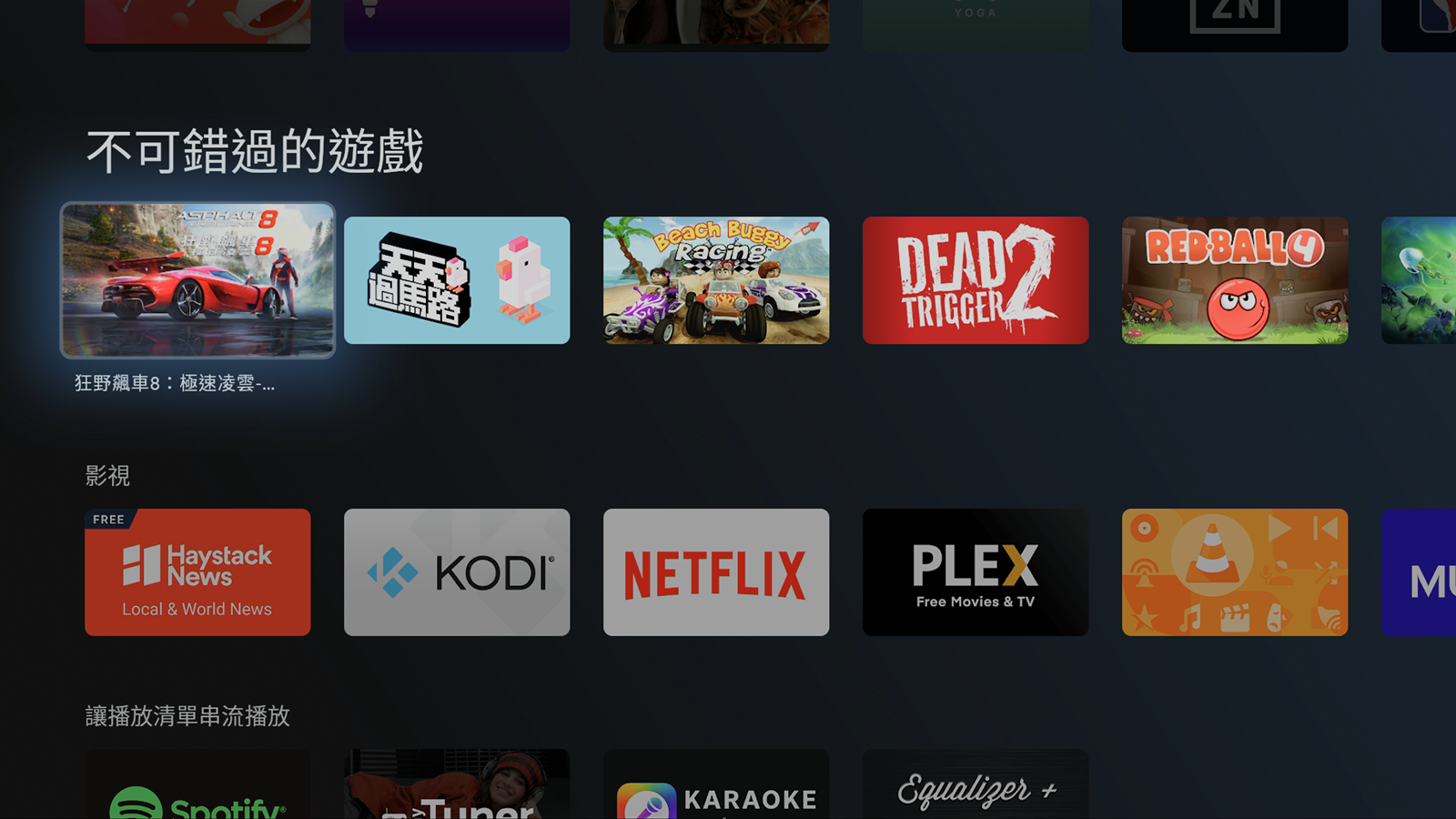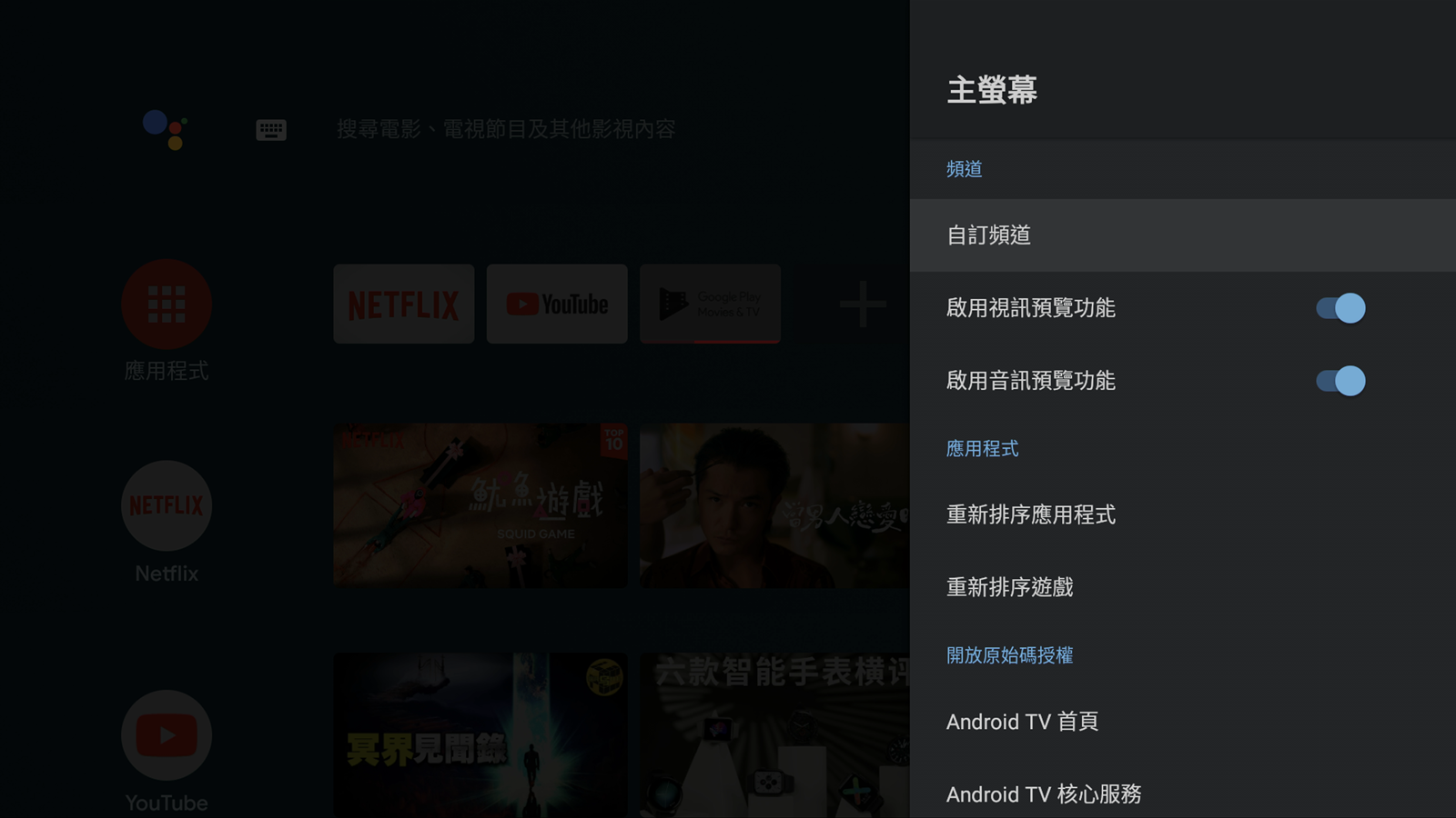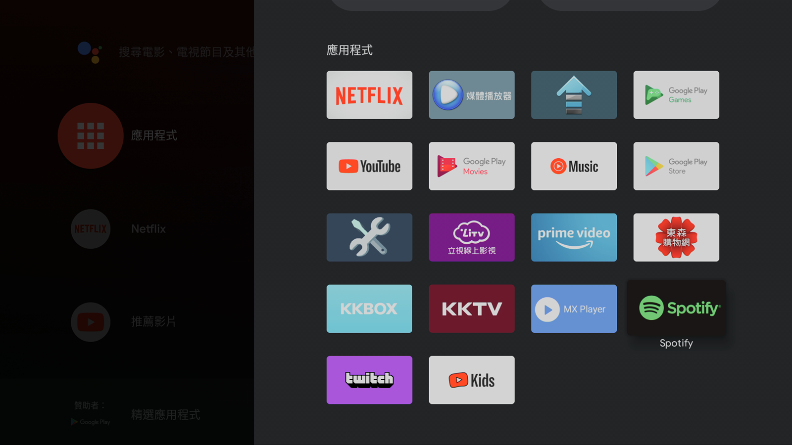 一開機之後的主要介面中,就會顯示出一般常用的影像串流平台,像是內建的 Netflix 跟 Youtube 等等,也有推薦使用者可以從 Google Play 下載其他應用程式,像是愛奇藝等等,會出現在推薦的應用程式中,使用者可以不必自己鍵入搜尋,直接在精選中尋找就好。