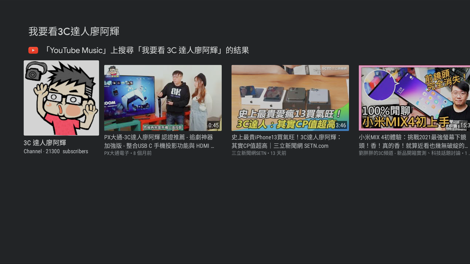 阿輝在 Youtube 畫面中對著遙控器說出「我要看 3C 達人廖阿輝」之後,就跳出阿輝的頻道(還有胖胖的= =)