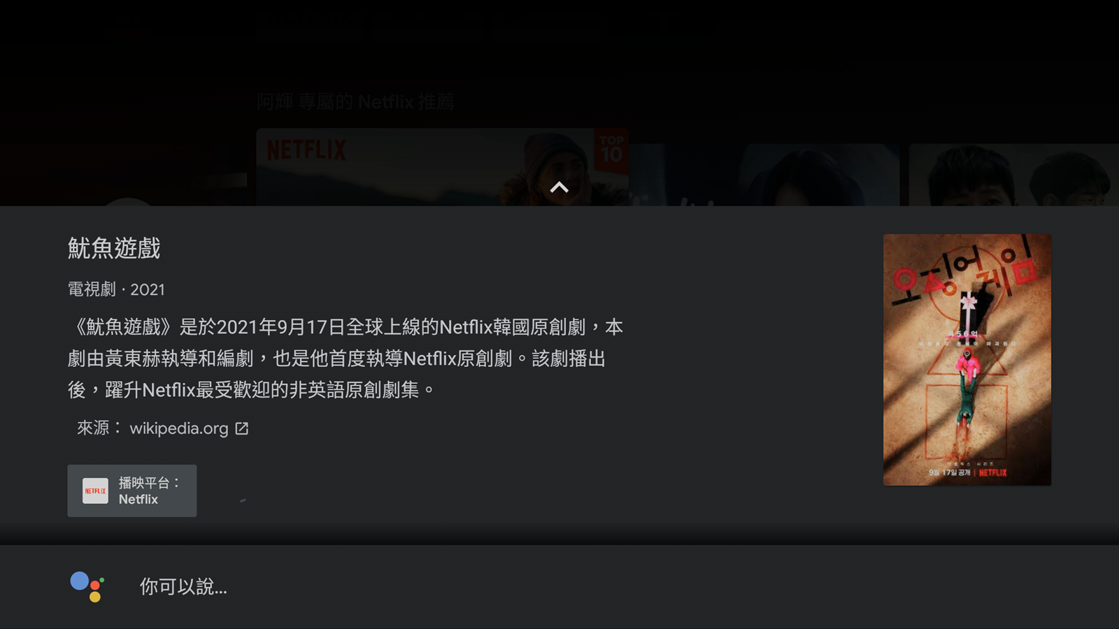魷魚遊戲的影集頁面還是跳出來了!並且下方還有說明播映平台是 Netflix 。