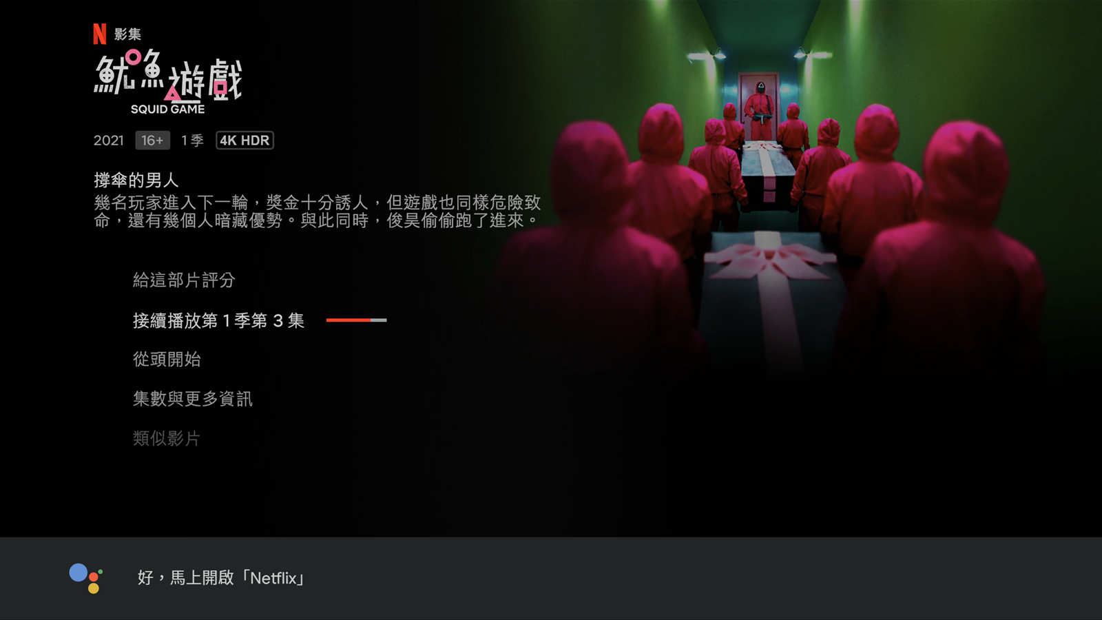 接著說開始播放,Dynalink 的 Google 語音助理功能就接收到正確資訊,開始播放魷魚遊戲。