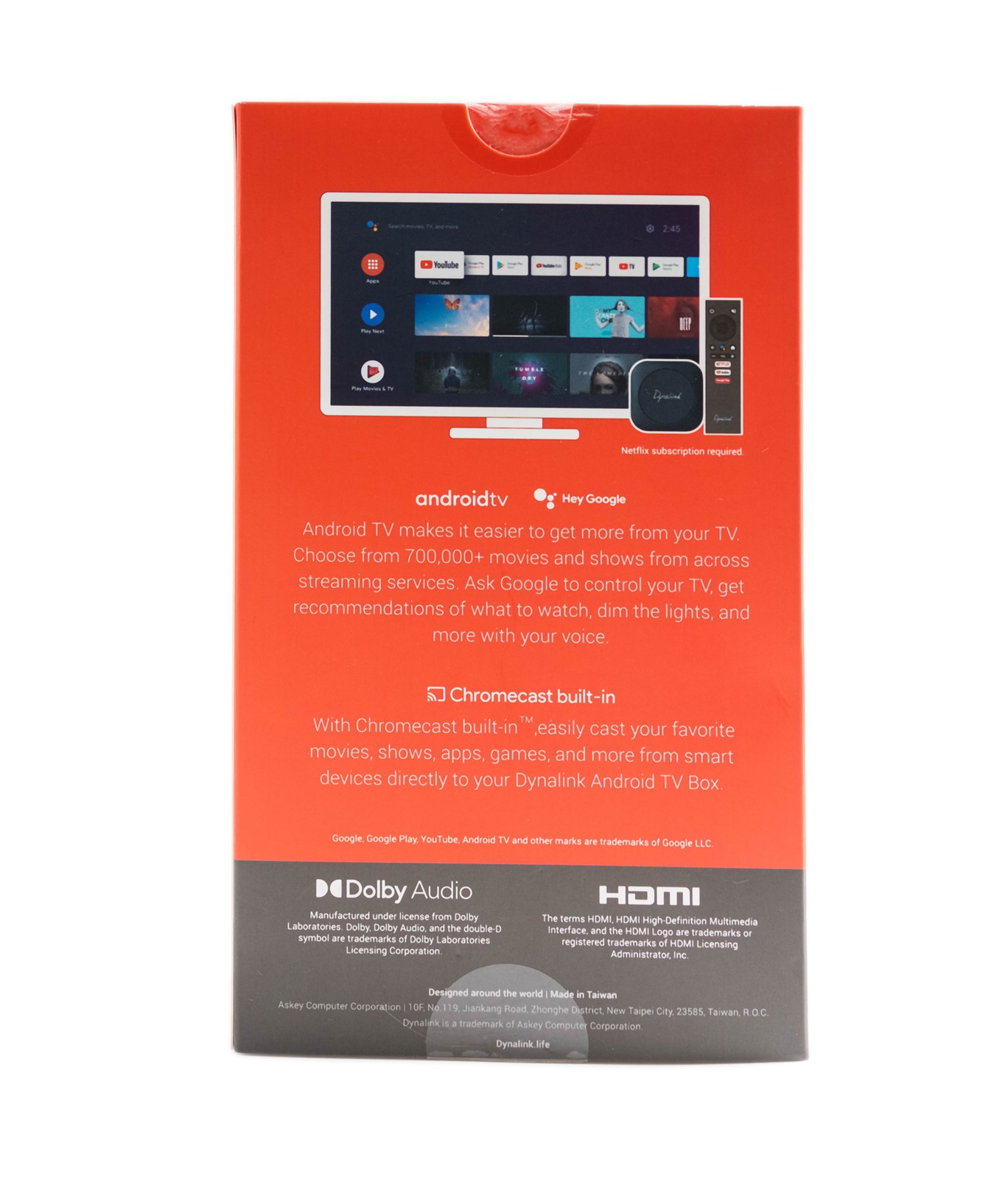 背面則是針對 Android TV 跟 Chromecast built-in 的說明,簡單來說就是透過 Dynalink Android TV Box 電視盒可以合法使用觀賞 Android TV 超過七十萬部影片等等,並且支援最好用的 ChromeCast 無線投影功能!