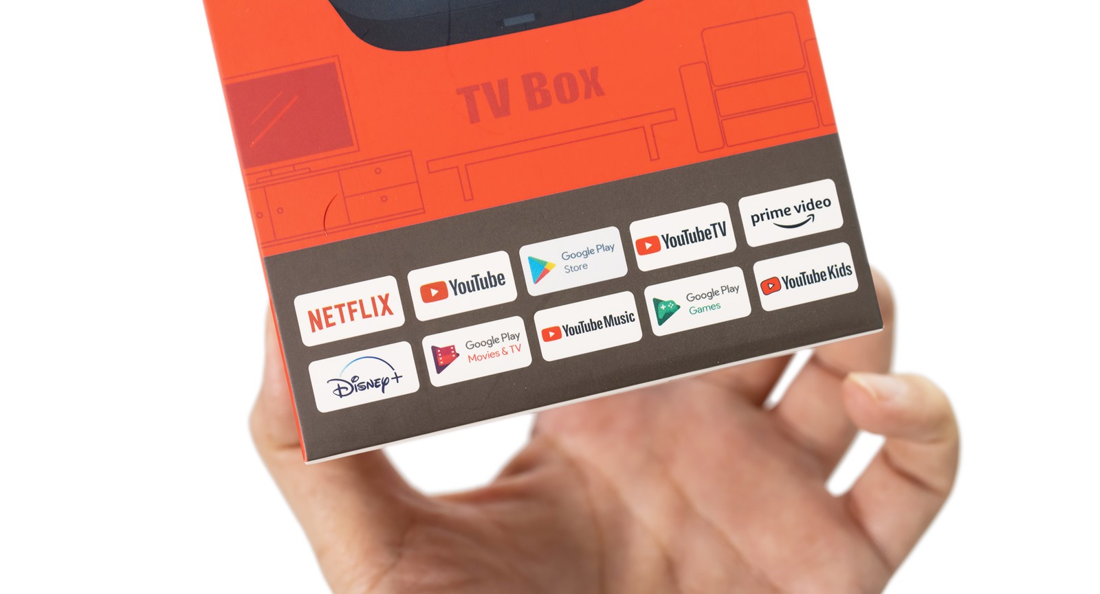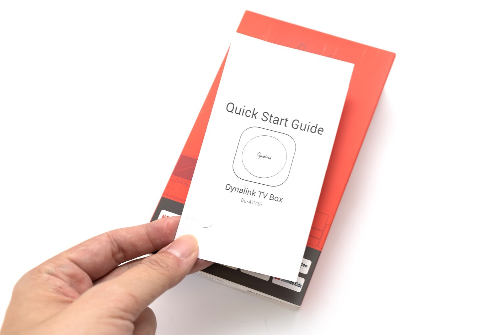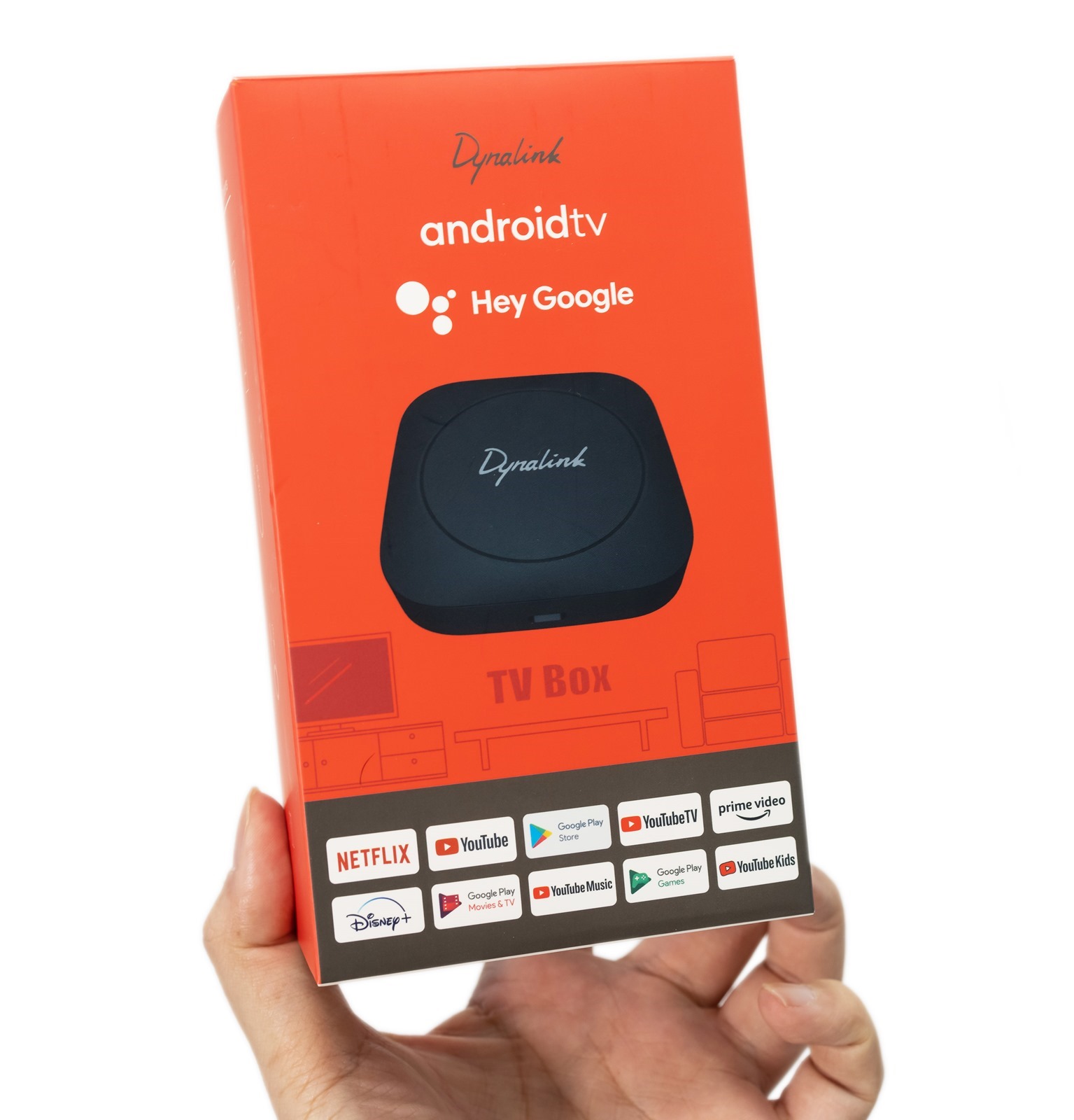 Dynalink Android TV Box 電視盒的盒子選色活潑可愛,亮眼的橘色配上活潑的字體跟 Dynalink Android TV Box 電視盒本人圖片,下面也有清楚的圖示告訴使用者,透過 Dynalink Android TV Box 電視盒可以使用哪些串流平台,真的要說這支援的串流平台真是有夠完整!