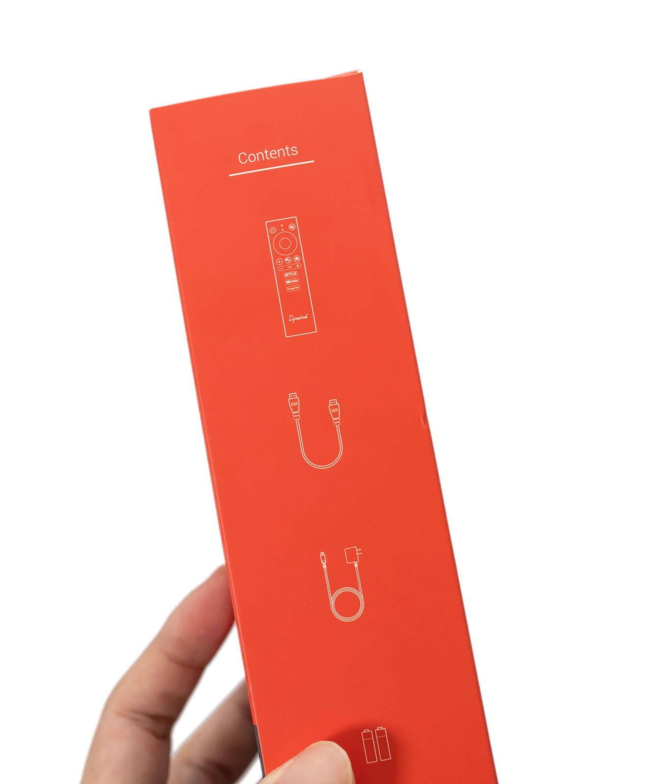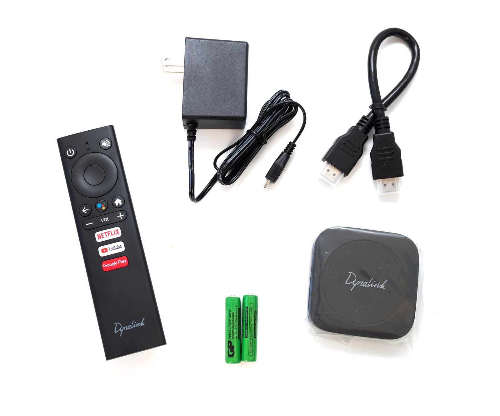 整盒打開之後,內容物有 Dynalink Android TV Box 電視盒機身、遙控器,HDMI 線跟變壓器還有電池。