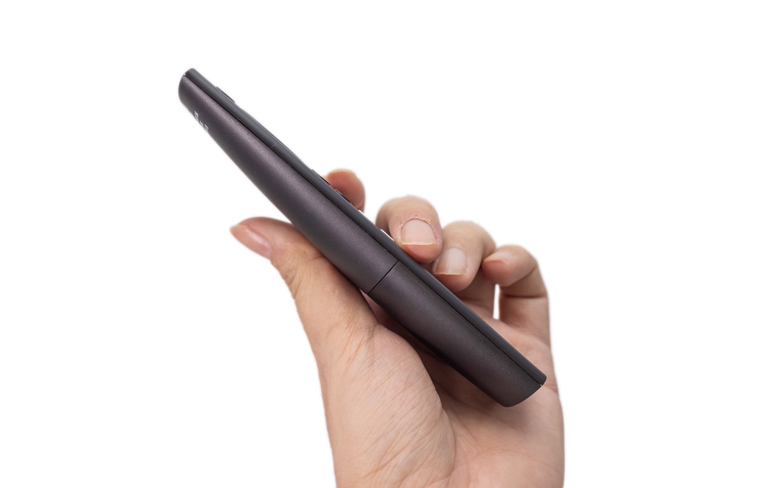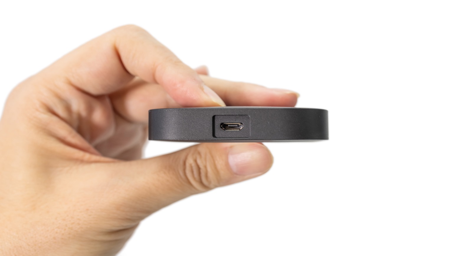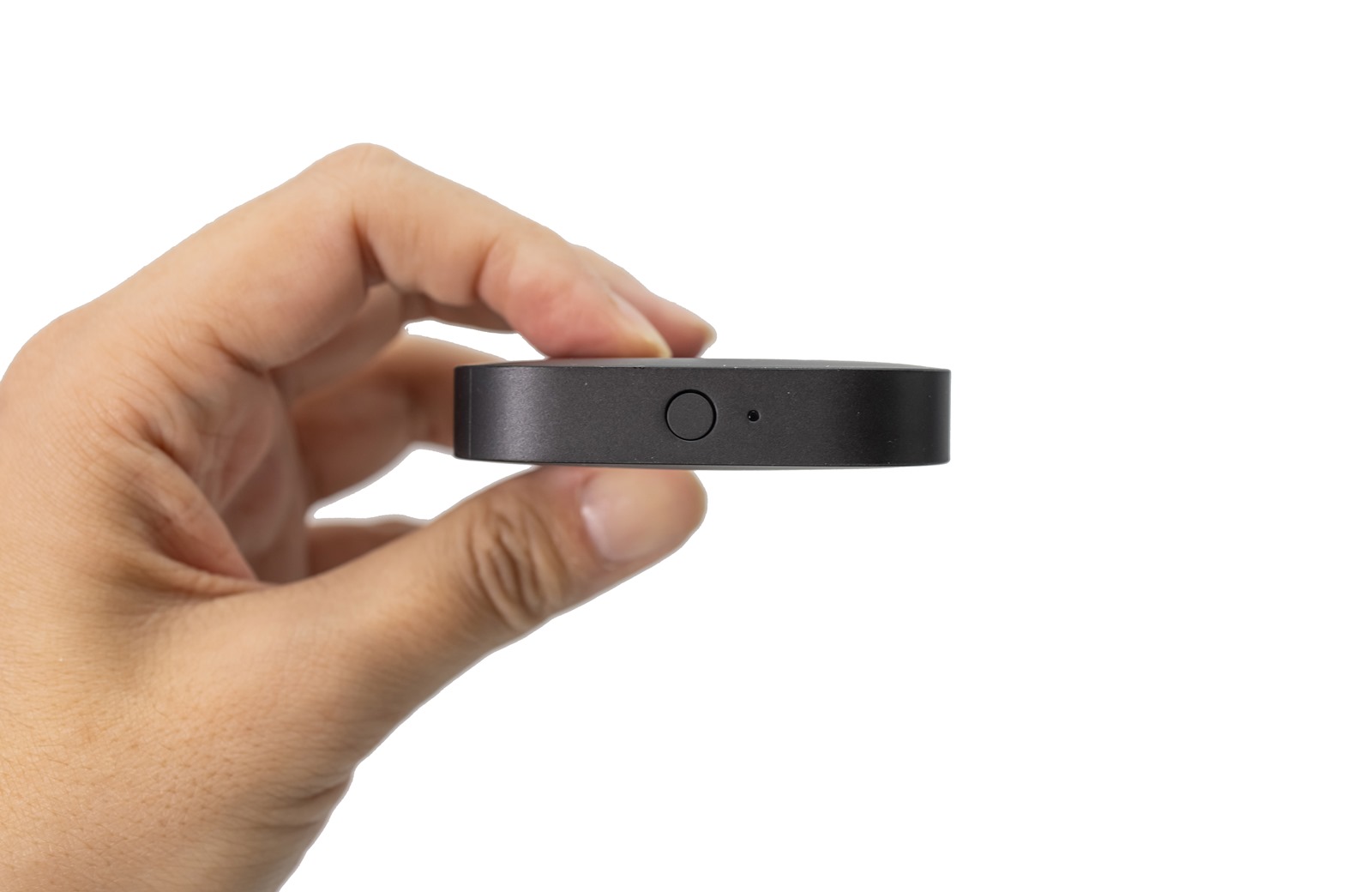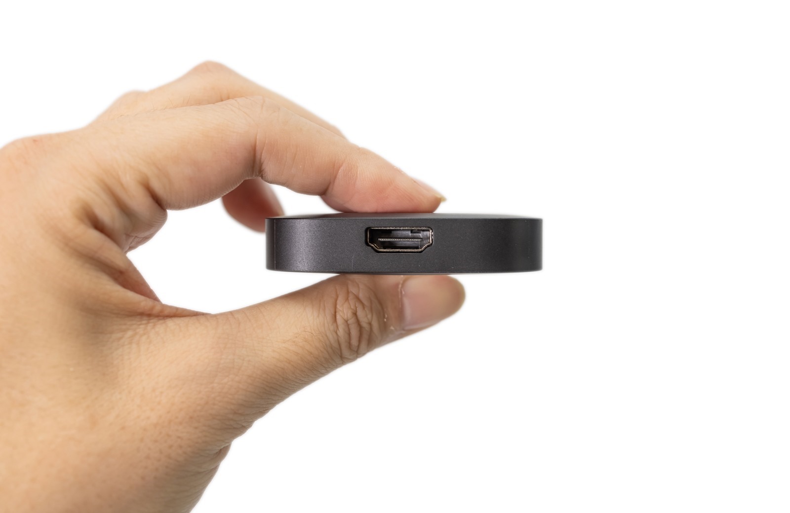 除了電源及 HDMI 線材的連接埠之外,它只有一個按鈕,就是開關。在窄扁的機身側面只有一個小小的圓形。