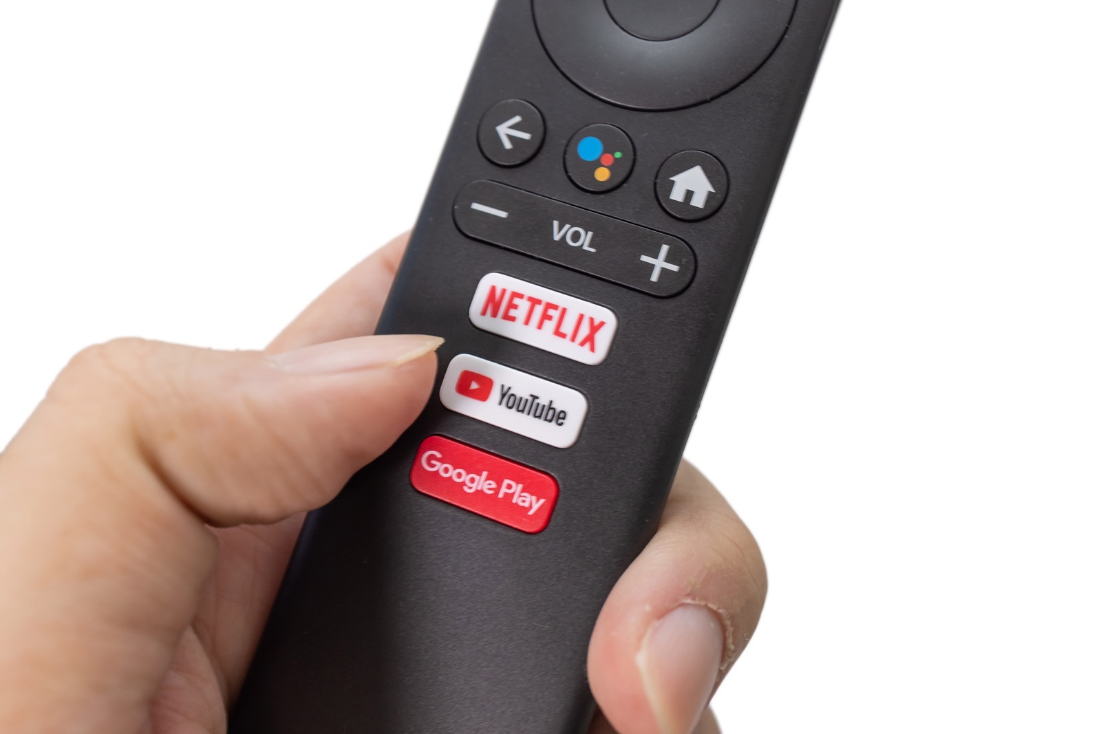不只線材、機身簡約漂亮,遙控器也設計得相當不錯,在畫面上就只有少少的幾個按鈕,好過傳統遙控一大堆根本用不到的控制鍵。而且直接在遙控上面設定 Netflix 、 Yuotube 跟 Google Play 基本上就真的是無腦開機直接隨按隨看了;喔對了遙控器還內建麥克風可以用於語音助理,這稍後當然會介紹,